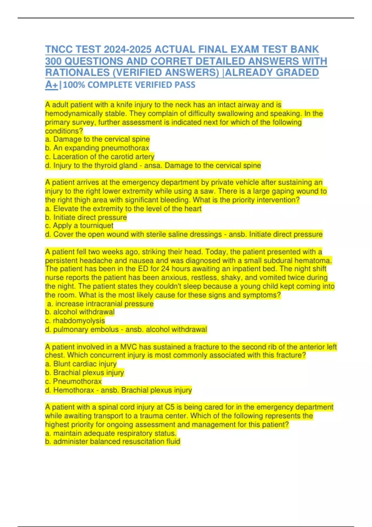 , TNCC TEST 2024-2025 ACTUAL FINAL EXAM TEST BANK