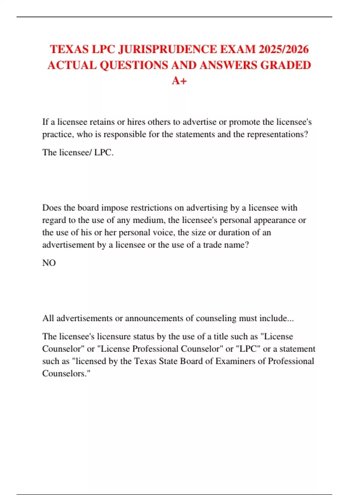 TEXAS LPC JURISPRUDENCE EXAM 2025/2026 ACTUAL QUESTIONS AND ANSWERS GRADED A+