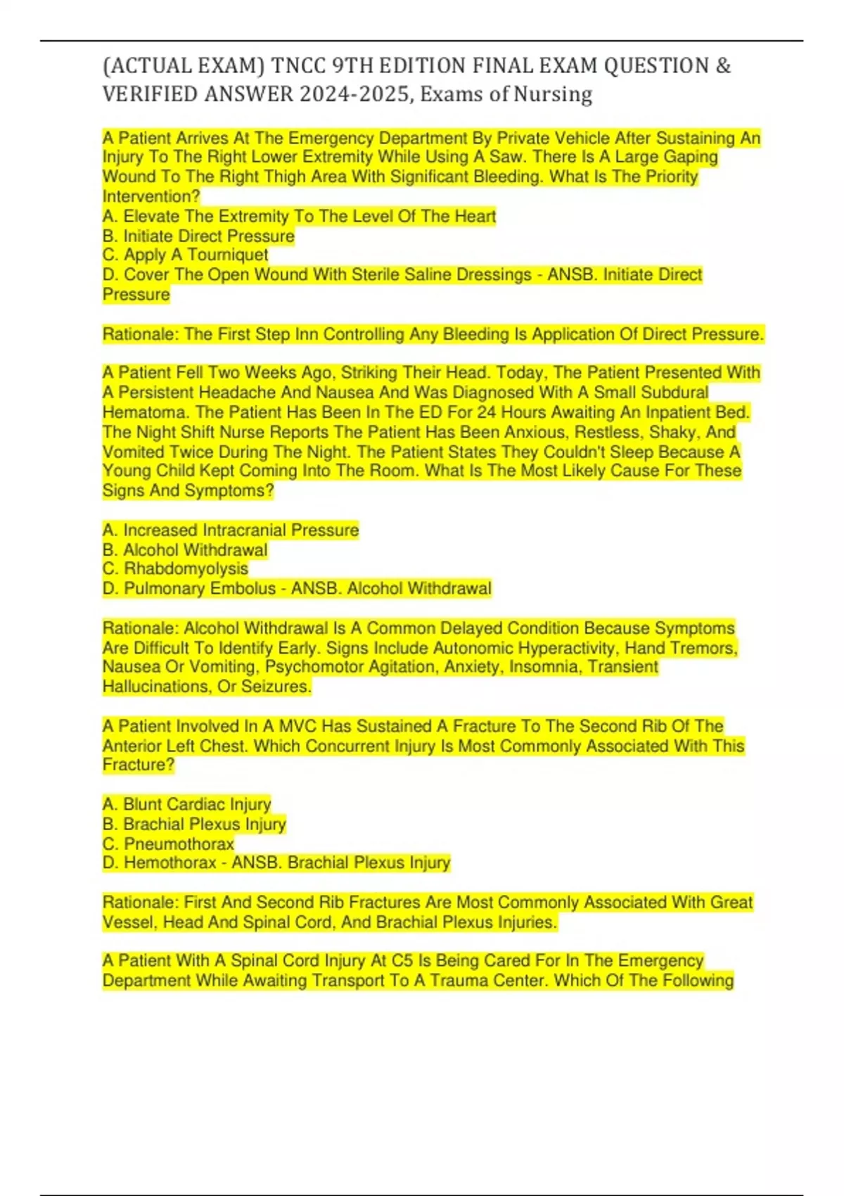 , (ACTUAL EXAM) TNCC 9TH EDITION FINAL EXAM QUESTION &