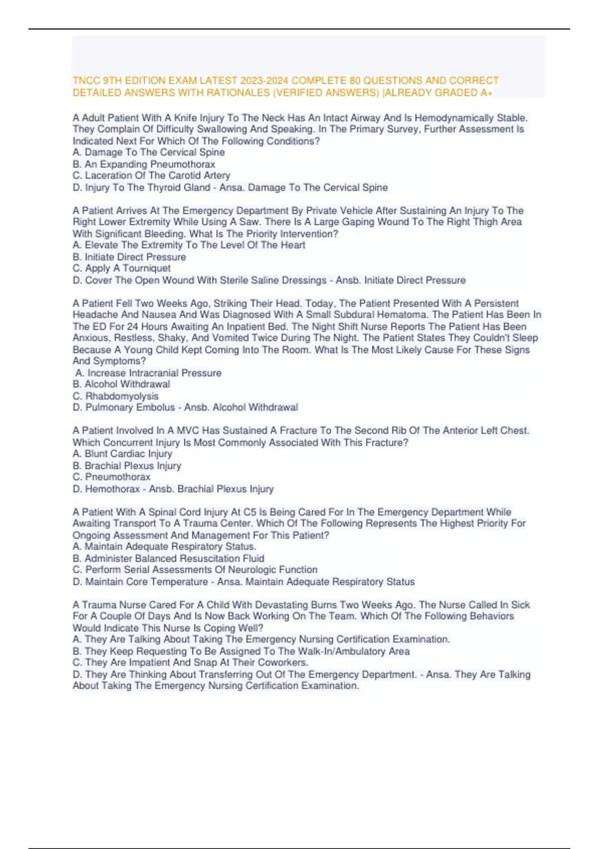 , TNCC 9TH EDITION EXAM LATEST 2023-2024 COMPLETE 80 QUESTIONS AND CORRECT