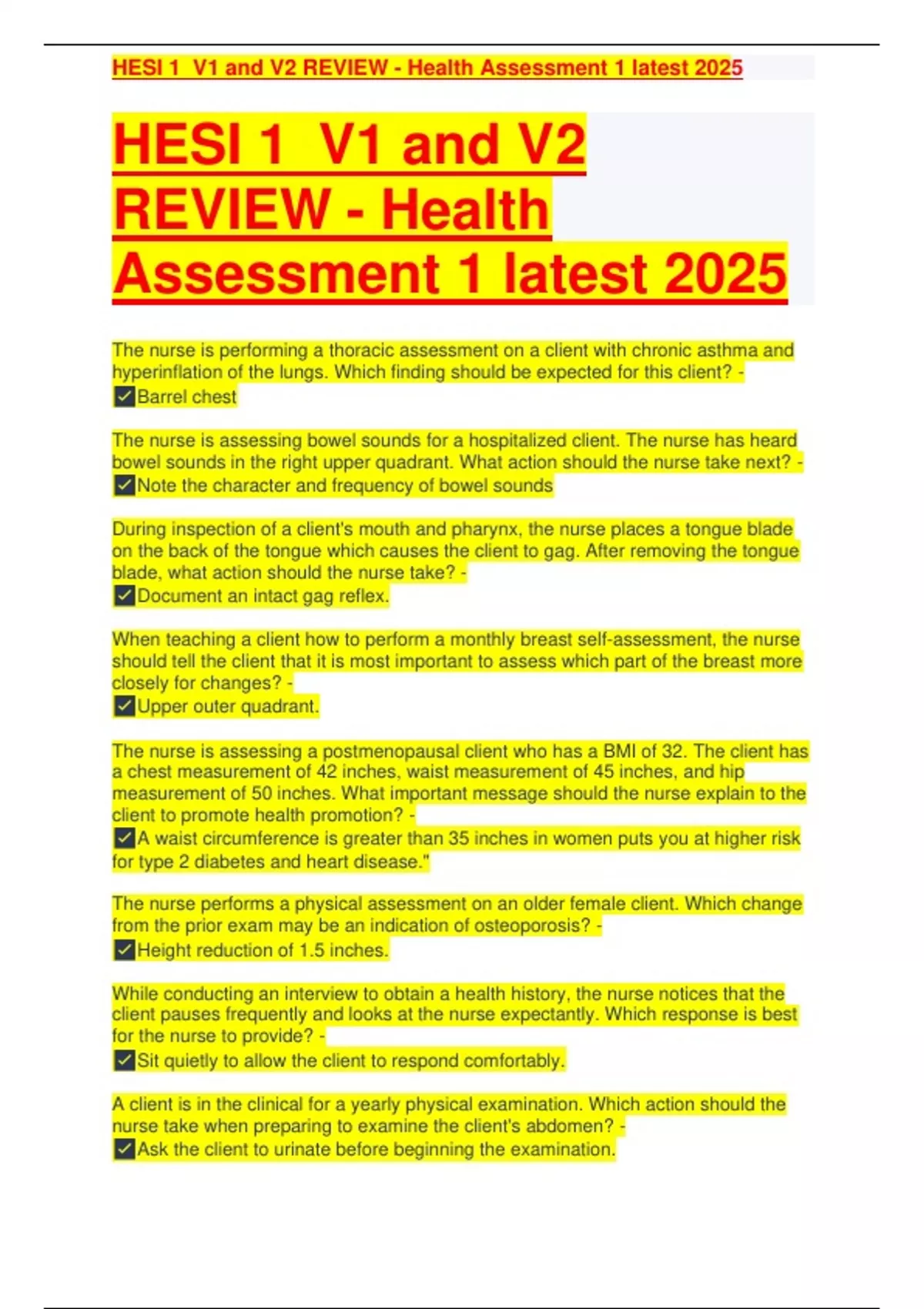 HESI 1 V1 and V2 REVIEW - Health Assessment 1 latest
