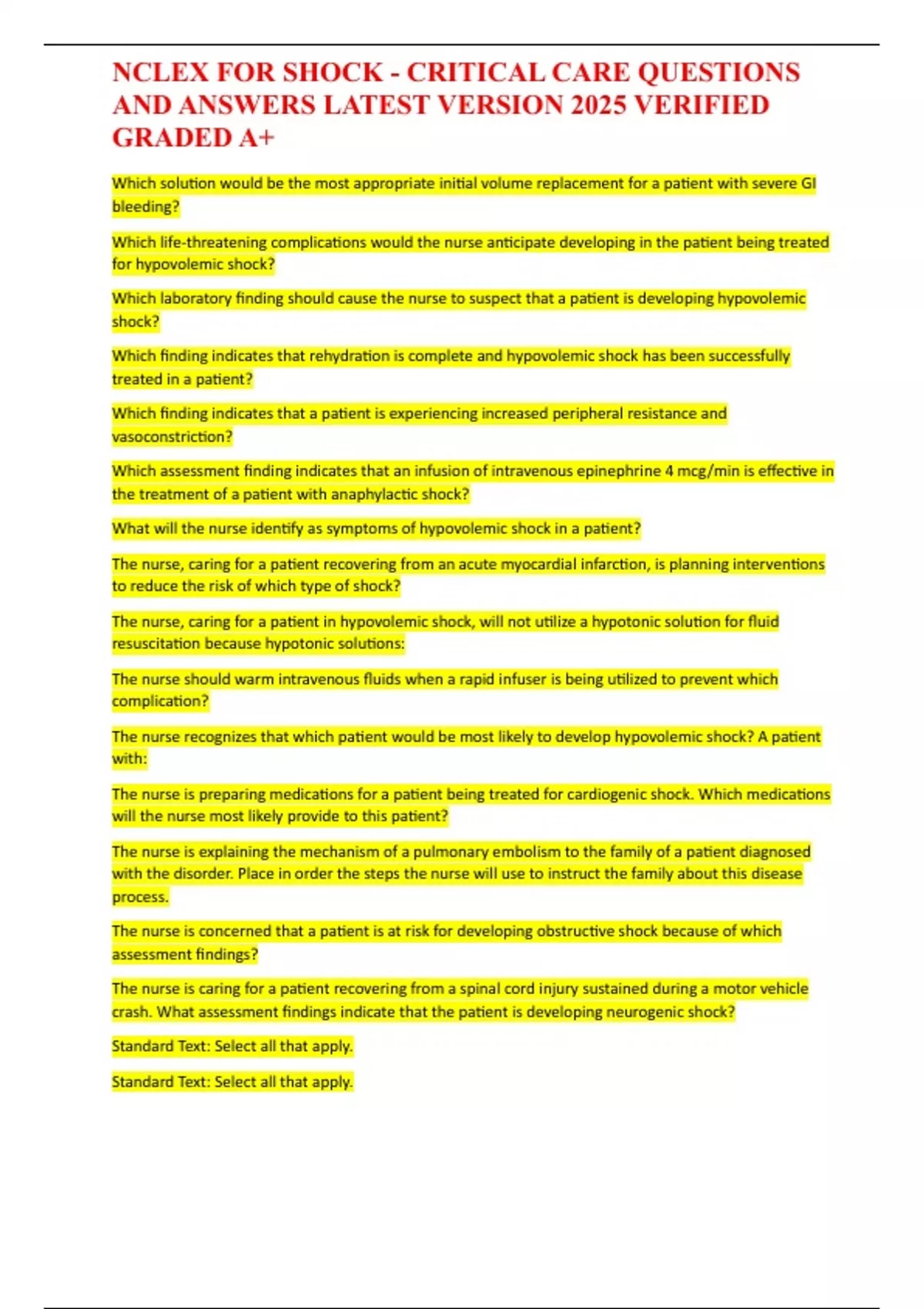 NCLEX FOR SHOCK - CRITICAL CARE QUESTIONS AND ANSWERS LATEST VERSION 20255 VERIFIED