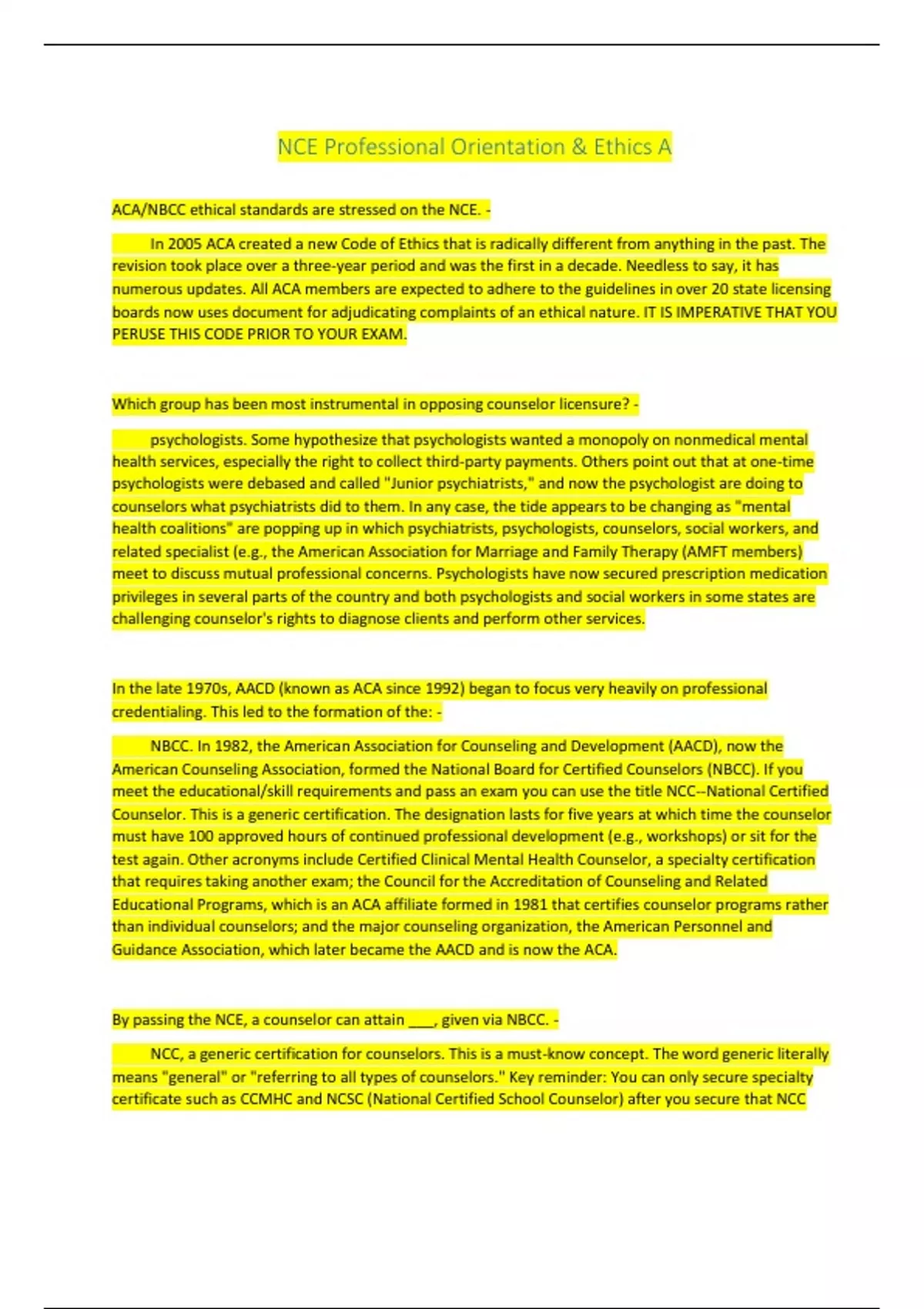 ACA/NBCC ethical standards are stressed on the NCE. -
