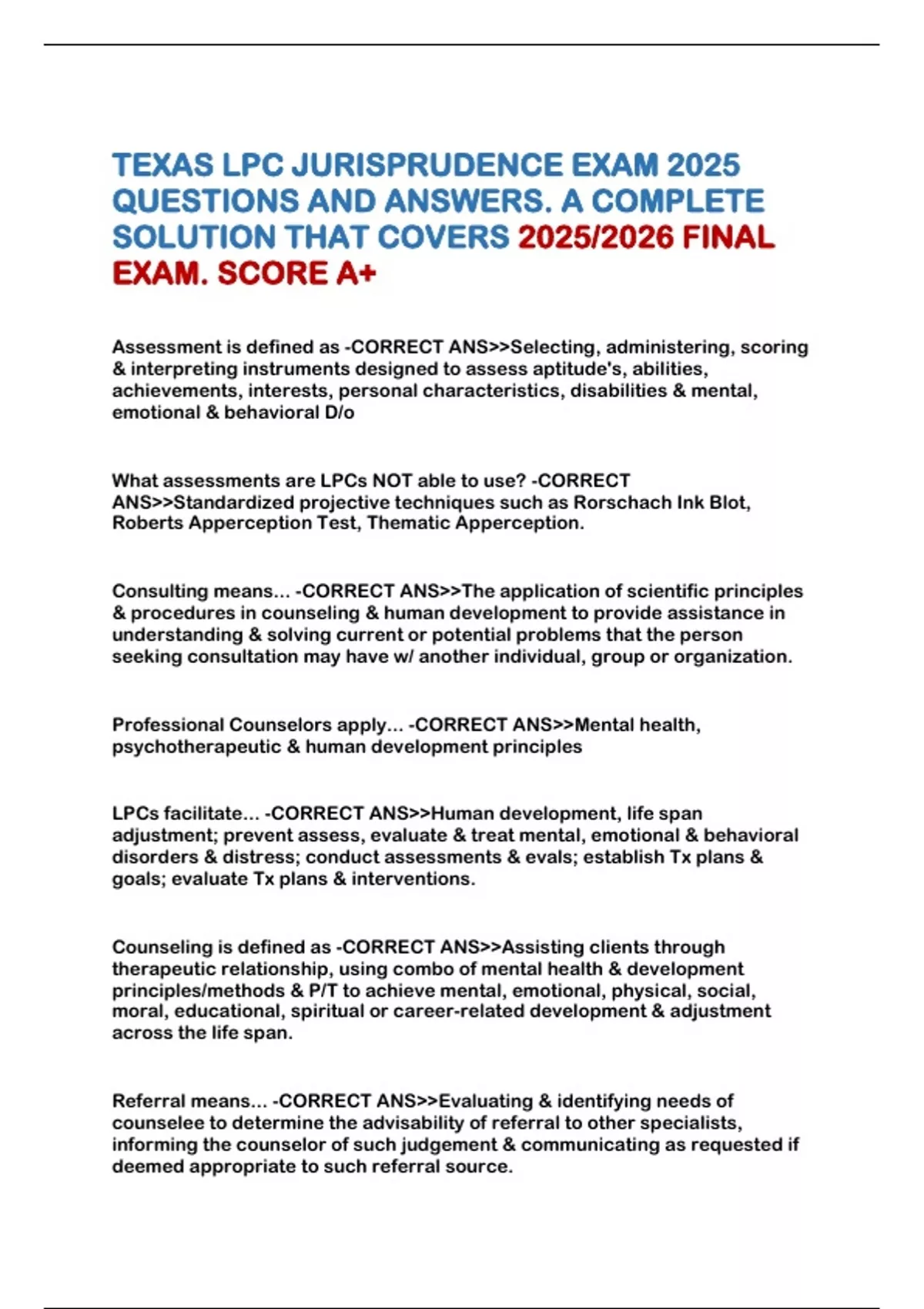 TEXAS LPC JURISPRUDENCE EXAM 2025 QUESTIONS AND ANSWERS. A COMPLETE SOLUTION THAT COVERS 2025/2026 FINAL EXAM. SCORE A+ Assessment is defined as -CORRECT ANS>>Selecting, administering, scoring & interpreting instruments designed to assess aptitude's, abilities, achievements, interests, personal characteristics, disabilities & mental, emotional & behavioral D/o What assessments are LPCs NOT able to use? -CORRECT ANS>>Standardized projective techniques such as Rorschach Ink Blot, Roberts Apperception Test, Thematic Apperception. Consulting means... -CORRECT ANS>>The application of scientific principles & procedures in counseling & human development to provide assistance in understanding & solving current or potential problems that the person seeking consultation may have w/ another individual, group or organization. Professional Counselors apply... -CORRECT ANS>>Mental health, psychotherapeutic & human development principles LPCs facilitate... -CORRECT ANS>>Human development, life span adjustment; prevent assess, evaluate & treat mental, emotional & behavioral disorders & distress; conduct assessments & evals; establish Tx plans & goals; evaluate Tx plans & interventions. Counseling is defined as -CORRECT ANS>>Assisting clients through therapeutic relationship, using combo of mental health & development principles/methods & P/T to achieve mental, emotional, physical, social, moral, educational, spiritual or career-related development & adjustment across the life span. Referral means... -CORRECT ANS>>Evaluating & identifying needs of counselee to determine the advisability of referral to other specialists, informing the counselor of such judgement & communicating as requested if deemed appropriate to such referral source. LPCs are regulated by... -CORRECT ANS>>Texas Occupations Code Chapter 503 - Professional Counselors Texas Occupations Code Chapter 503 - Professional Counselors is also known as -CORRECT ANS>>Licensed Professional Counselors Act Texas Occupations Code Chapter 503 - Professional Counselors aka Licensed Professional Counselors Act does NOT allow for... -CORRECT ANS>>practice of medicine, law, counseling for government or educational institutions, counselor interns, federal employees, social workers, pastoral counselors, public/private nonprofits, rehab counselors & music therapists. Does the Texas occupational code have a separate specialization for art therapy? -CORRECT ANS>>YES LPCs are regulated by -CORRECT ANS>>Texas State Board of Examiners of Professional Counselors Texas State Board of Examiners of Professional Counselors falls under CORRECT ANS>>The Department is State Health Services Licensed Professional Counselor or Licensed Counselor implies... -CORRECT ANS>>the person is licensed, trained, experienced or expert in counseling & engages in any practice of counseling w/ individuals, couples, families & groups for compensation.