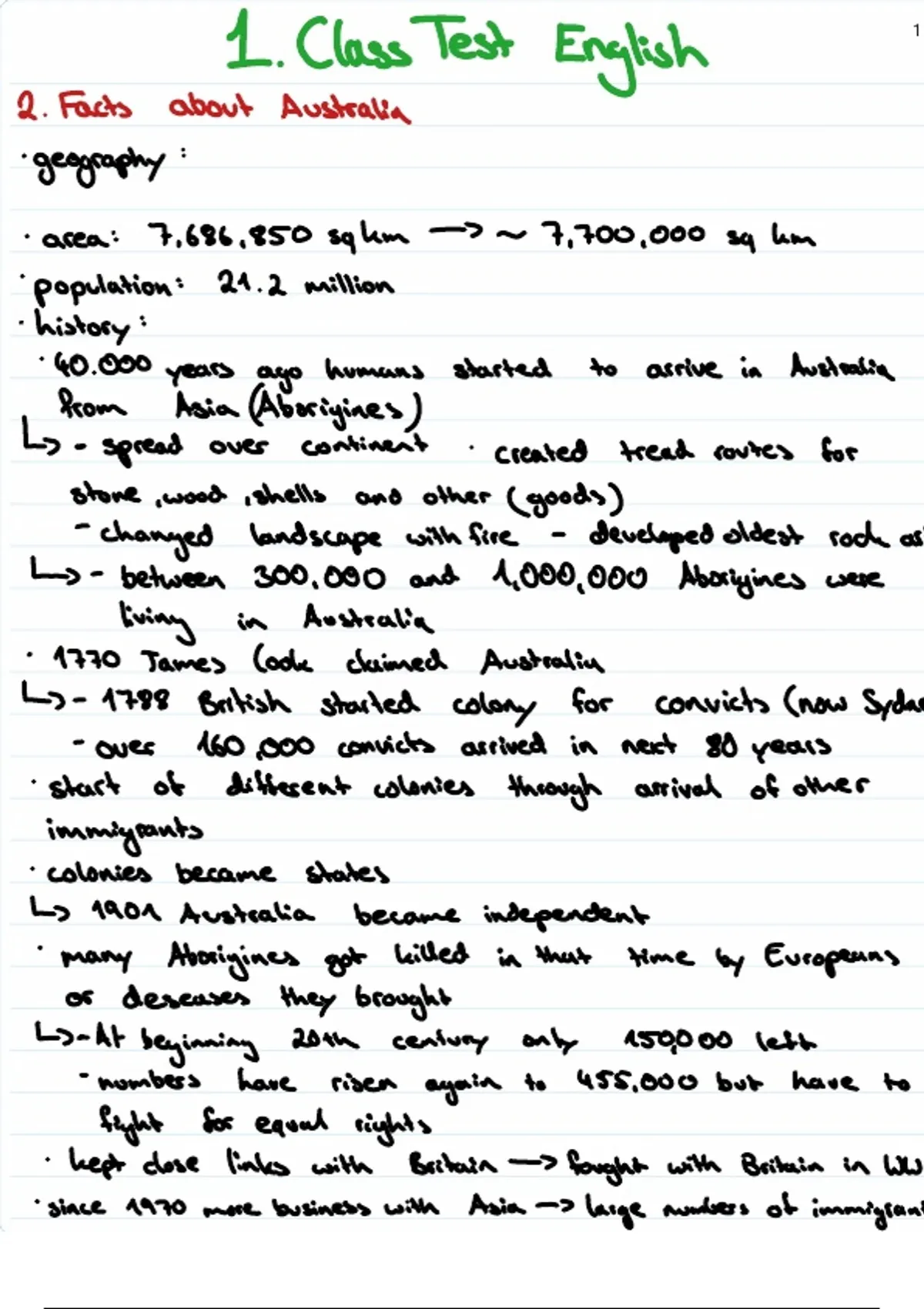 Diese klare und übersichtliche Zusammenfassung für den Englischunterricht der 9. Klasse deckt zentrale Themen über Australien ab. Perfekt zur Vorbereitung auf Tests, Klassenarbeiten oder um dein Wissen über "Down Under" aufzufrischen. Enthaltene Themen im Überblick: Fakten über Australien: Geographie, Fläche, Einwohnerzahl. Geschichte Australiens: Von den Ureinwohnern (Aborigines) über die Ankunft von James Cook (1770) und der britischen Sträflingskolonien bis zur Unabhängigkeit. The Great Barrier Reef: Seine immense Artenvielfalt und die gravierenden Umweltgefahren (Klimawandel, Verschmutzung), die ihn bedrohen. Lifestyle Comparison: Ein direkter Vergleich des australischen und deutschen Lebensstils (Schule, Freizeitaktivitäten, Kosten, Berufe, Siedlungsgebiete). Biographie von James Cook: Sein Leben, seine Karriere als Entdecker und seine Reisen nach Australien und in die Südsee. Grammatik: Der Unterschied zwischen "Since" and "For" (Present Perfect). Ideal für: Schüler der 9. Klasse, die sich auf eine Prüfung zum Thema Australien vorbereiten, ihre Mitschrift ergänzen oder einen schnellen und effektiven Überblick über die wichtigsten Fakten benötigen.
