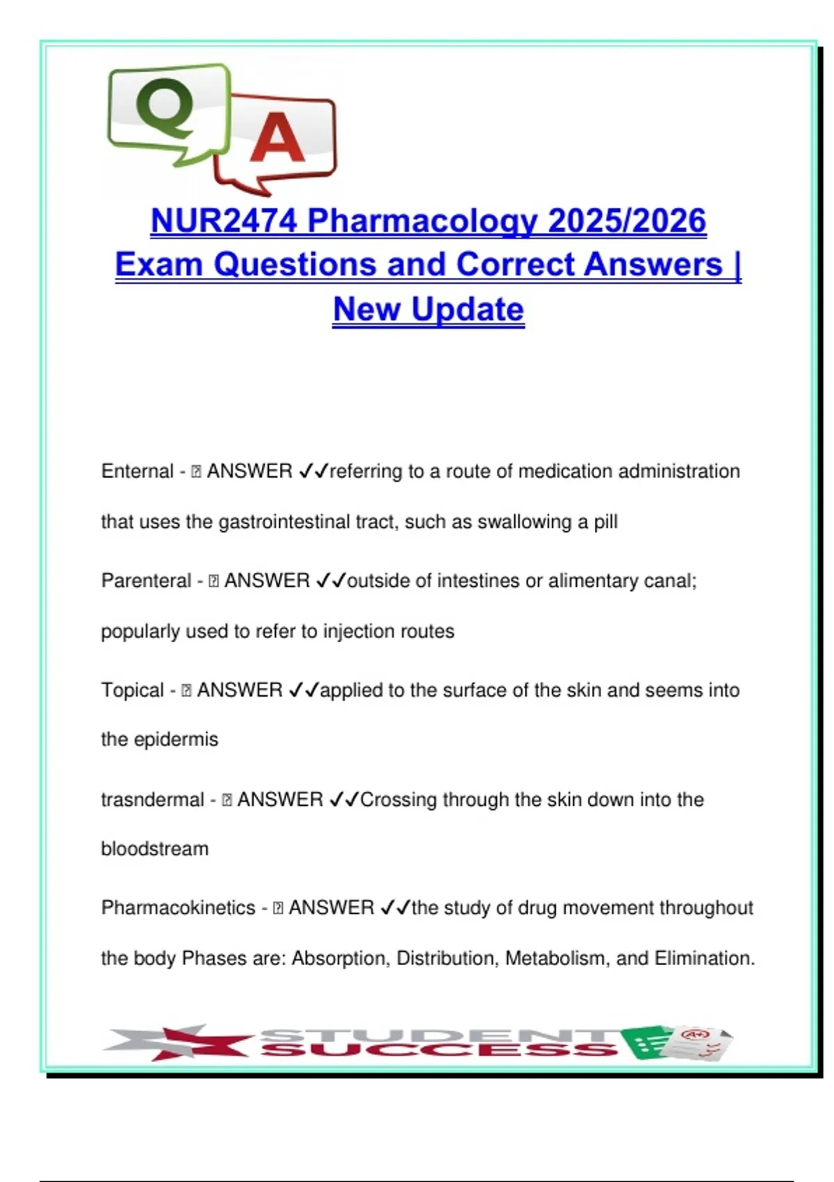 Pharmacology – 100+ Exam Questions with Answers | NUR2474 | Nursing | Routes, Pharmacokinetics, Administration Safety