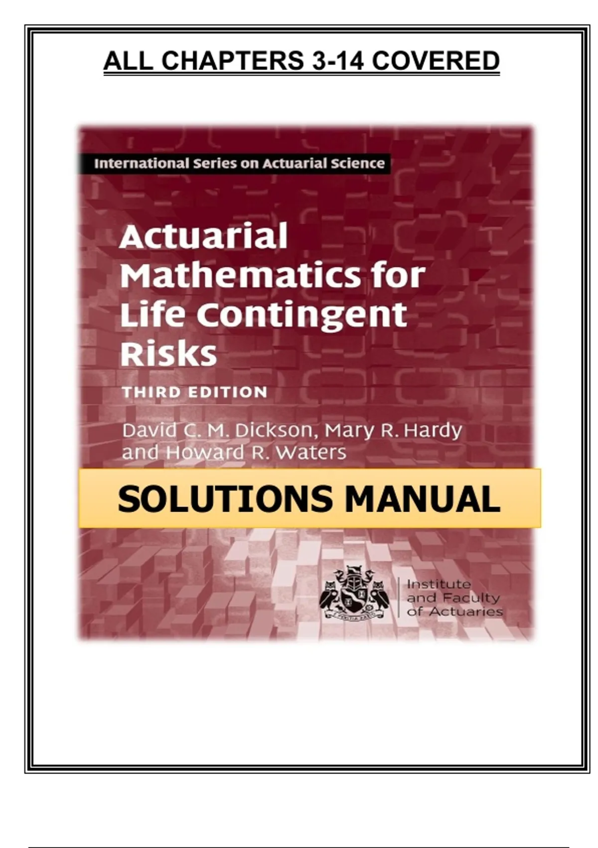 INSTANT PDF DOWNLOAD. Complete solutions manual for Actuarial Mathematics for Life Contingent Risks (3rd Edition) by David C. M. Dickson, Mary R. Hardy, and Howard R. Waters. Covers chapters 3–14 with detailed worked solutions to exercises and problems. An essential companion for actuarial students preparing for professional exams and mastering life contingencies, annuities, and survival models. actuarial mathematics solutions manual, life contingent risks textbook answers, dickson hardy waters solutions pdf, actuarial exam prep solutions, life contingencies problems solved, actuarial mathematics chapter solutions, actuarial science solutions manual, institute and faculty of actuaries textbook solutions, actuarial mathematics exam prep pdf, survival models solved exercises, life contingent risks problems solved, actuarial course companion pdf, annuities actuarial problems solved, actuarial mathematics worked examples, actuarial exams practice solutions, actuarial mathematics student manual, life insurance mathematics solved pdf, actuarial modeling solutions manual, actuarial problems with answers pdf, actuarial mathematics textbook exercises