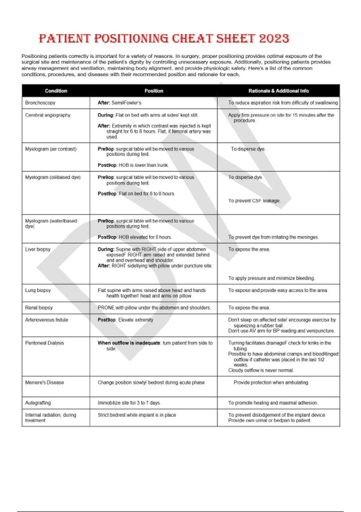 PATIENT POSITIONING CHEAT SHEET 2023 Positioning patients correctly is important for a variety of reasons. In surgery, proper positioning provides optimal exposure of the surgical site and maintenance of the patient's dignity by controlling unnecessary exposure. Additionally, positioning patients provides airway management and ventilation, maintaining body alignment, and provide physiologic safety. Here's a list of the common conditions, procedures, and diseases with their recommended position and rationale for each.