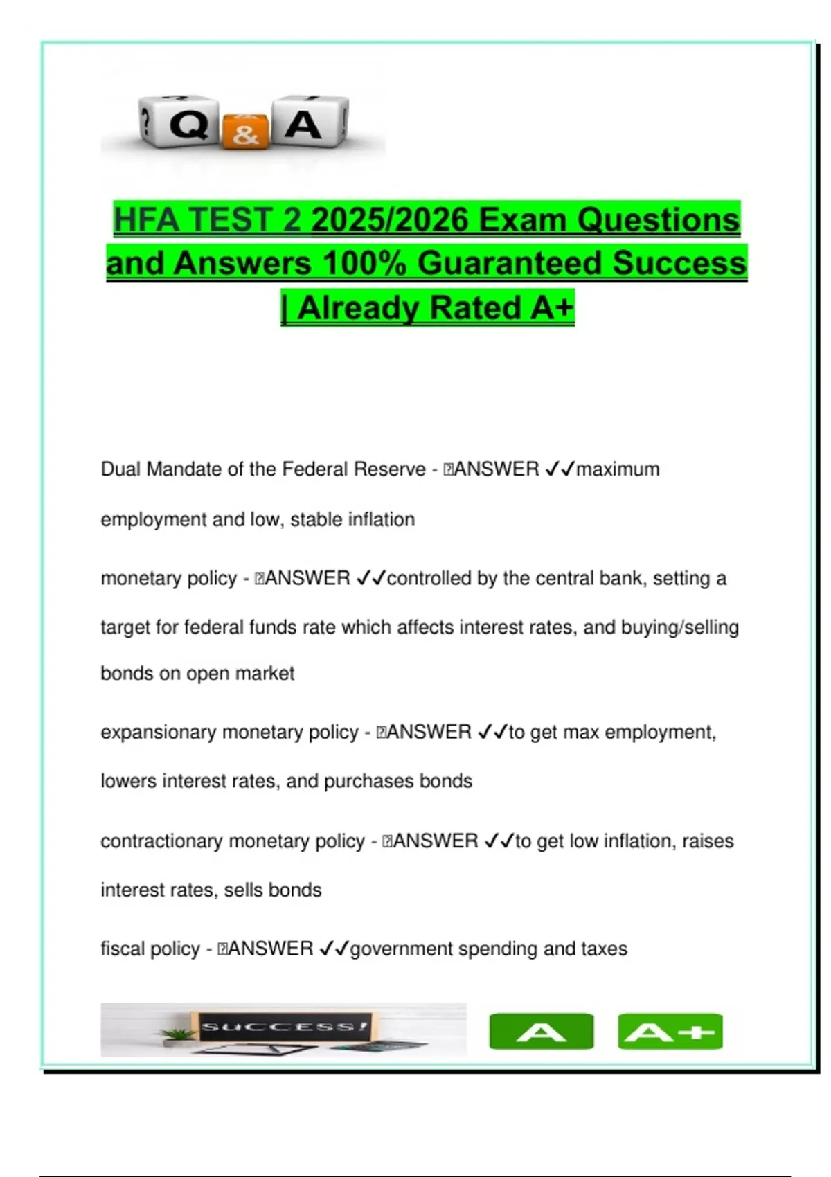 This document features 80+ exam-focused questions and model answers for HFA Test 2, part of the Indiana Health Facility Administrator (HFA) licensure preparation for the 2025/2026 cycle. Unlike purely regulatory material, this portion of the exam emphasizes broader economic, financial, and policy-related knowledge critical for health facility managers overseeing budgets, planning, and compliance in institutional settings. The topics are derived from foundational economic theories and real-world policy tools, including: Monetary policy tools: federal funds rate, interest rate adjustments, bond operations Expansionary and contractionary policies, and their role in employment and inflation control Fiscal policy mechanisms: government spending, taxation, and economic stimulation Key historical frameworks such as the Gold Standard and Bretton Woods System Economic schools of thought: Keynesian vs. Neoclassical, Milton Friedman and Monetarism Exchange rate systems, floating vs. fixed Basic financial concepts: standard deviation, coefficient of variation, cost of capital, cost of equity Introduction to risk, return, and economic reasoning applicable in administrative and investment planning This guide is ideal for: AIT candidates and licensed administrators in Indiana preparing for multi-topic HFA tests Health facility managers who require operational and financial literacy for budgeting, compliance, and facility oversight Students in healthcare administration, public health policy, or business management programs Professionals pursuing CEU or multi-disciplinary exam prep involving both regulatory and financial domains Structured in a clean, answer-verified format, this guide helps reinforce concepts through repetition, short-answer definitions, and applied examples—ensuring broad understanding of healthcare administration from a strategic, economic perspective. Keywords: HFA exam, Indiana health administration, AIT, monetary policy, fiscal policy, interest rates, Keynesian economics, neoclassical, Milton Friedman, cost of capital, cost of equity, standard deviation, coefficient of variation, floating exchange rate, economic theory, healthcare budgeting, financial literacy, HFA licensure prep, public policy, federal reserve
