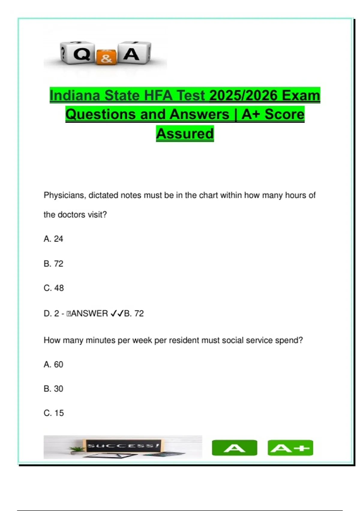 This document contains over 250 exam-style questions and correct answers for the Indiana State Health Facility Administrator (HFA) Test—a core requirement for licensure in Indiana for the 2025/2026 cycle. The content is deeply rooted in Indiana’s administrative code and ISDH (Indiana State Department of Health) guidelines, offering comprehensive prep across clinical, legal, operational, and ethical domains relevant to facility administration. Topics thoroughly covered include: Resident care regulations: restraint monitoring, transfer and discharge timelines, admission assessments, grievance rights, and required disclosures AIT (Administrator-in-Training) guidelines: training limits, off-site duration, supervision duties, and preceptor responsibilities Clinical oversight: DON and ADON duties, resident record documentation, CPR coverage, infection control meetings, QMRP qualifications, and dietitian staffing Licensing and compliance: provisional licensing, CEU limitations, HFA and CNA practice rules, board notification timelines, and administrator vacancy procedures Facility environment standards: lighting requirements (foot candles), toilet and bathroom ratios, water temperature regulations, and physical plant expectations Infection control protocols: universal precautions, infectious waste handling, bleach solution ratios, HBsAG status, ERP (Expert Review Panel) procedures Personnel records and staff policies: minimum retention periods, orientation documentation, and prohibited tasks for QMAs Legal and disciplinary mechanisms: attorney general investigations, transfer hearing deadlines, classification of breaches, and civil penalty thresholds Perfect for: AITs and future HFAs preparing for the Indiana licensure exam Facility administrators needing a complete and updated legal refresher Students in healthcare administration programs or long-term care courses Compliance officers, directors of nursing, and HR staff at Indiana-licensed facilities This guide is exam-ready and formatted in a clean Q&A structure for fast memorization and regulatory comprehension—ideal for both new candidates and experienced professionals needing a rules-based reference. Keywords: Indiana HFA exam, AIT rules, preceptor requirements, resident rights, restraint policy, infection control, universal precautions, ADON duties, clinical records, dietary staffing, lighting regulations, toilet requirements, provisional license, CEU limits, CNA rules, ERP, HBsAG, administrative law, ISDH compliance, grievance process, HFA licensure
