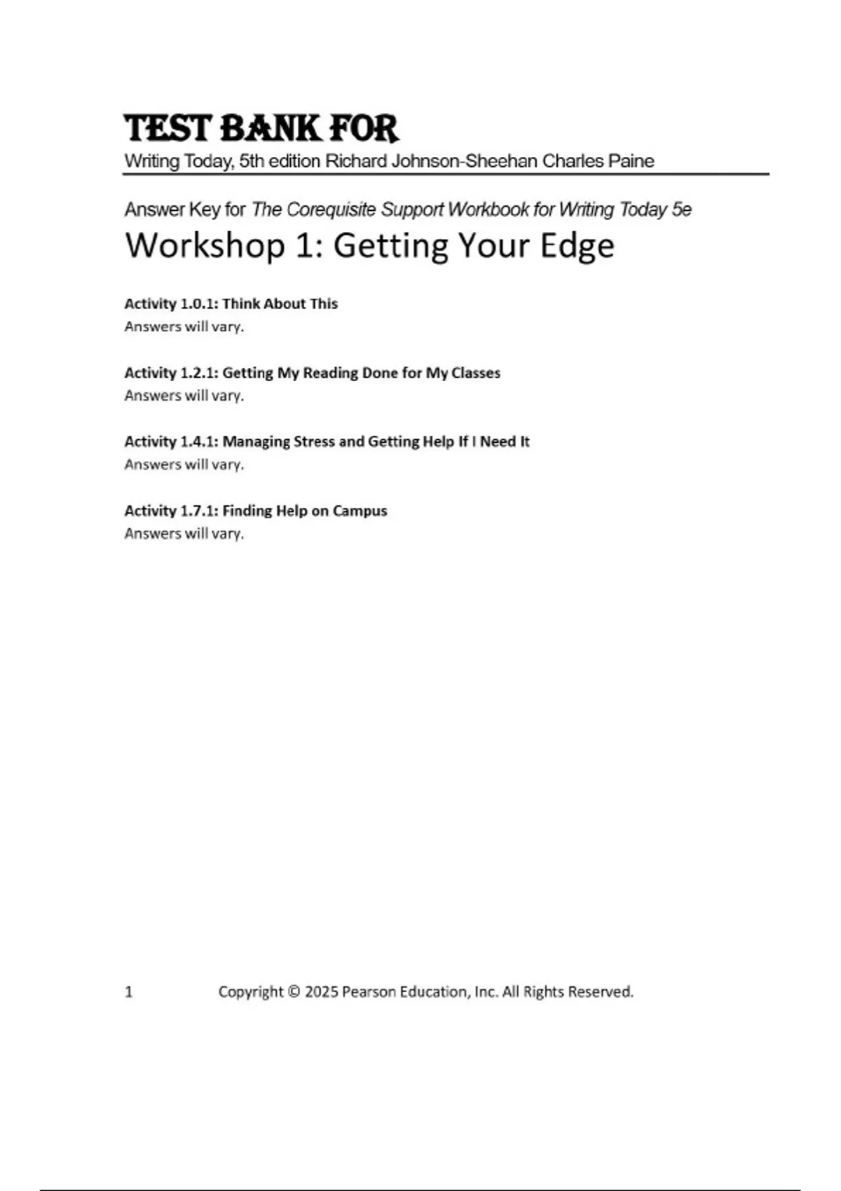 TEST BANK FOR Writing Today, 5th edition Richard Johnson-Sheehan Charles Paine Answer Key for The Corequisite Support Workbook for Writing Today 5e Workshop 1: Getting Your Edge