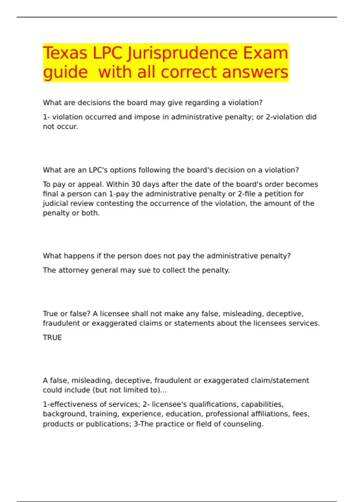 Texas LPC Jurisprudence Exam guide with all correct answers