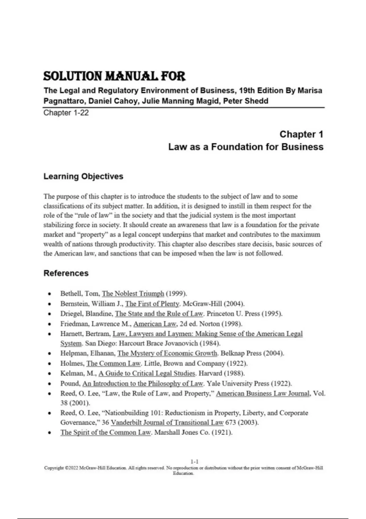SOLUTION MANUAL FOR The Legal and Regulatory Environment of Business, 19th Edition By Marisa Pagnattaro, Daniel Cahoy, Julie Manning Magid, Peter Shedd Chapter 1-22