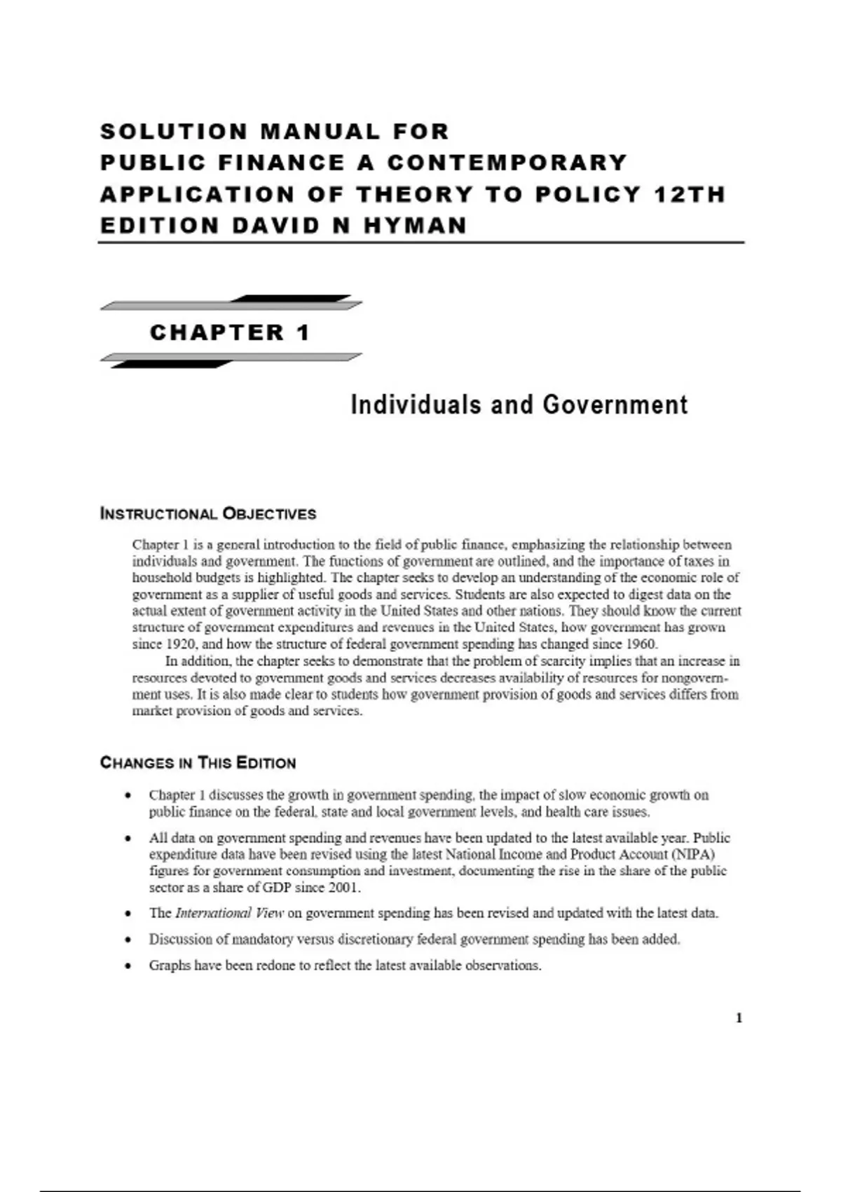 solution manual for public finance a contemporary application of theory to policy 12th edition david n hyman MAJOR POINTS AND LECTURE SUGGESTIONS 1. 2. My objective in the first lecture is to make it clear to students how economic analysis of the functions and activities of governments fits in with their other courses. Since most students have already had at least one course in microeconomics, I point out how governments can be thought of as agents for supplying goods and services whose quantities have been determined through political, as opposed to market, interaction. The role of government in the mixed economy is schematically illustrated with a modified circular flow diagram. Figure 1.2 represents a useful starting point for illustrating how the economic analysis of government fits in with previous analyses of markets to which most students will have already been exposed. I usually draw the diagram on the board and show how both households and business firms have economic relations with governments. The tradeoff between government goods and services, and private goods and services is illustrated with the production possibility curve. Figure 1.1 is familiar to most students, and its application to analysis of government goods and services usually captures their attention. It helps to use the graph in class to discuss reallocation of resources from military to nonmilitary uses. Another interesting use of the graph is to show how increased environmental quality improvement services supplied by government will require the sacrifice of material goods and services, as the prices of such products as fuel, electricity, and automobiles rise. ©2021 Cengage Learning, Inc. All Rights Reserved. May not be scanned, copied or duplicated, or posted to a publicly accessible website, in whole or in part. 3. 4. Emphasize that government goods and services are usually made available through nonprice rationing: a. Government goods are often available for collective use at no direct charge, as is the case for roads, national defense, police services, fire protection, and environmental protection. b. Eligibility for obtaining the benefits of government services is determined by criteria other than ability and willingness to pay. Politically determined criteria, such as age, income, family status, and location of residence, often determine a person's eligibility to receive government transfers such as food stamps and services such as public schooling. A general listing of the functions of government, as discussed in the text, is useful to students. These functions are as follows: a. Provision of useful goods and services, including the establishment of property rights and the underlying legal system b. Redistribution of income and economic opportunity among citizens c. Stabilization (Note that this is not covered in the text.) d. Regulation of private action 5. Note that the discussion of government finance in the chapter briefly outlines the fact that the consequences of alternative means of finance differ in terms of the impact on incentives to produce and on the distribution of well-being. 6. I usually photocopy the tables in Chapter 1 and bring them to class for the second lecture. I believe that it is important for students to have some appreciation of the current extent of government and the growth of expenditures and revenues in recent years. 7. 8. 9. In addition to illustrating the growth of government, I seek to show how the structure of federal government expenditure has changed significantly since 1960. First, point out to students the spectacular growth in the relative importance of transfers from 1960 to 1980. You can also point out that transfers stabilized at close to 40 percent of federal spending in the 1970s. After declining slightly as a share of federal spending in the 1980s, they rose again in the 1990s and now account for about 43 percent of federal spending. Federal government purchases of goods and services for consumption and investment has declined from over 60 percent of federal spending in 1960 to 27 percent in 1999. Since the end of the Cold War, purchases have declined as defense spending has been cut back. However, the terrorist attacks of September 11, 2001, resulted in both increased government spending and a shift away from transfers toward government consumption. In discussing actual expenditures, use Table 1.3 and the accompanying pie chart to show the importance of Social Security, income security, Medicare, and health for the federal government; and point out that these programs account for about 63 percent of federal government expenditures. Also point out that about 32 percent of state and local government expenditure is accounted for by education. Health care spending by state and local governments, mainly for Medicaid, has been growing rapidly and now accounts for about 24 percent of state and local government spending. Use the data and accompanying pie charts in the chapter to show students how income taxes, including payroll taxes and corporate profits taxes, account for more than 90 percent of federal government revenue. Also point out that sales and property taxes account for nearly half of state and local government revenues and that one in five dollars of receipts received by state and local governments comes from federal grants-in-aid. 10. Many instructors are now spending more time in class discussing state and local government fiscal problems. A section in Chapter 1 discusses the structural problems that are underlying state
