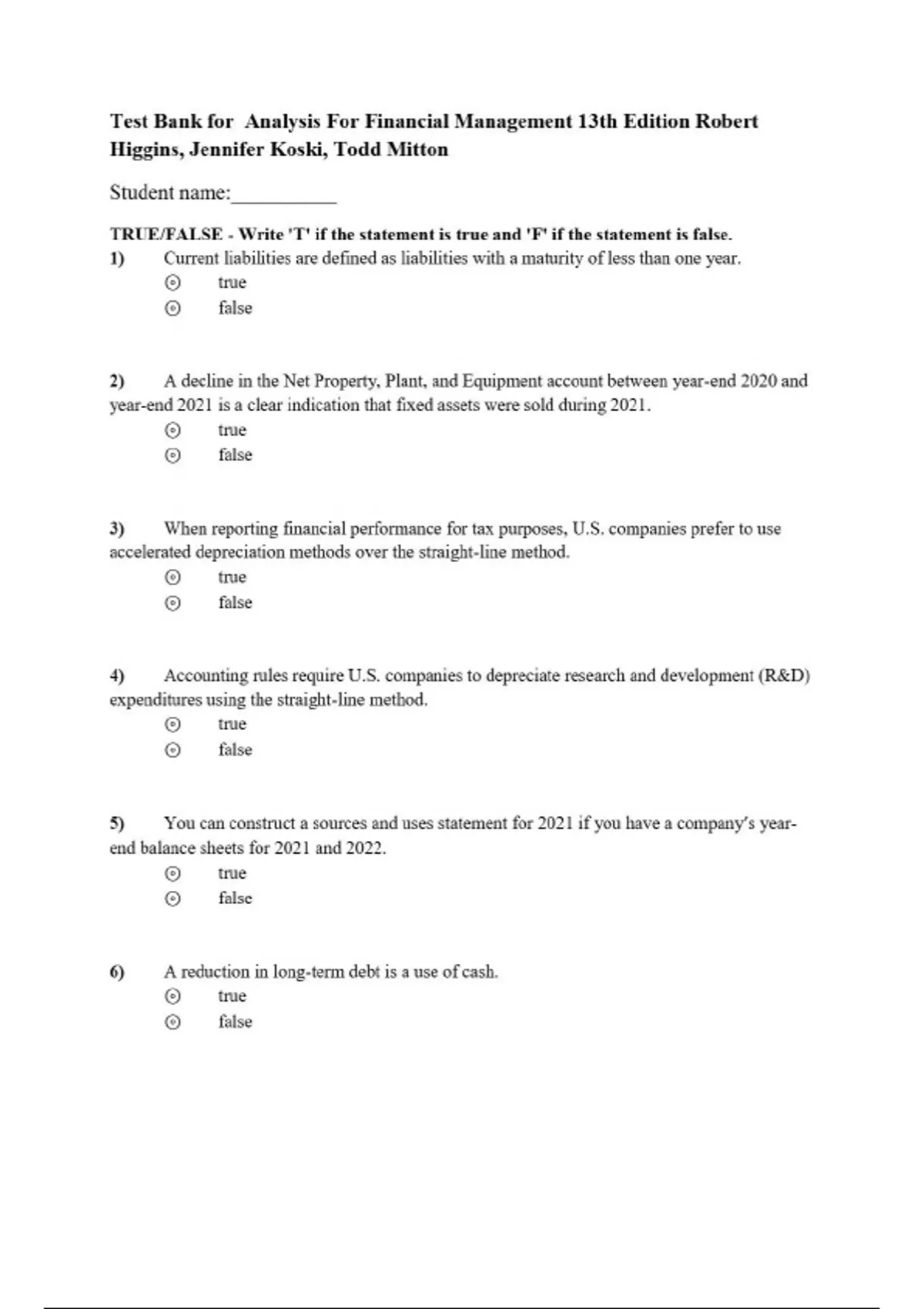 Test Bank for Analysis For Financial Management 13th Edition Robert Higgins, Jennifer Koski, Todd Mitton