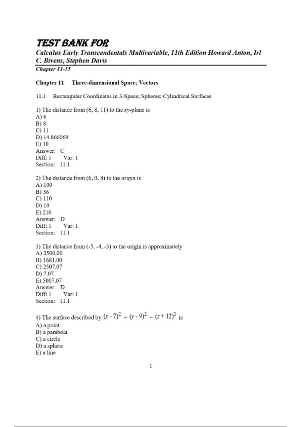 Test Bank for Calculus Early Transcendentals Multivariable, 11th Edition Howard Anton, Irl C. Bivens, Stephen Davis CHapter 11-15