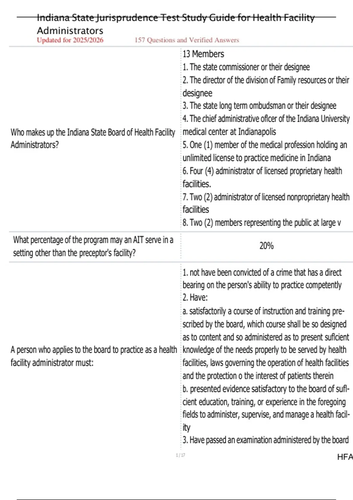 Prepare with confidence for the Indiana Health Facility Administrator (HFA) State Jurisprudence Exam using this updated 2025/2026 study guide. This comprehensive resource includes verified questions and accurate answers aligned with the Indiana Board of Health Facility Administrators’ current rules and regulations. Perfect for candidates preparing for the Indiana HFA licensing exam, this guide helps you understand key legal principles, memorize state-specific rules, and pass your test on the first attempt. Updated for 2025/2026 exam Verified and accurate answers Covers all Indiana HFA jurisprudence topics Designed for easy study and last-minute review Ideal for Health Facility Administrator candidates and students Master the Indiana HFA Jurisprudence Exam — study smarter, not harder.