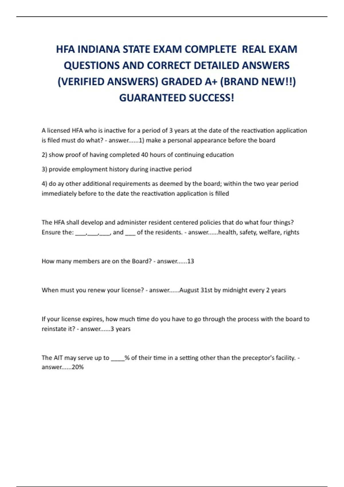 HFA INDIANA STATE EXAM COMPLETE REAL EXAM QUESTIONS AND CORRECT DETAILED ANSWERS (VERIFIED ANSWERS) GRADED A+ (BRAND NEW!!) GUARANTEED SUCCESS!
