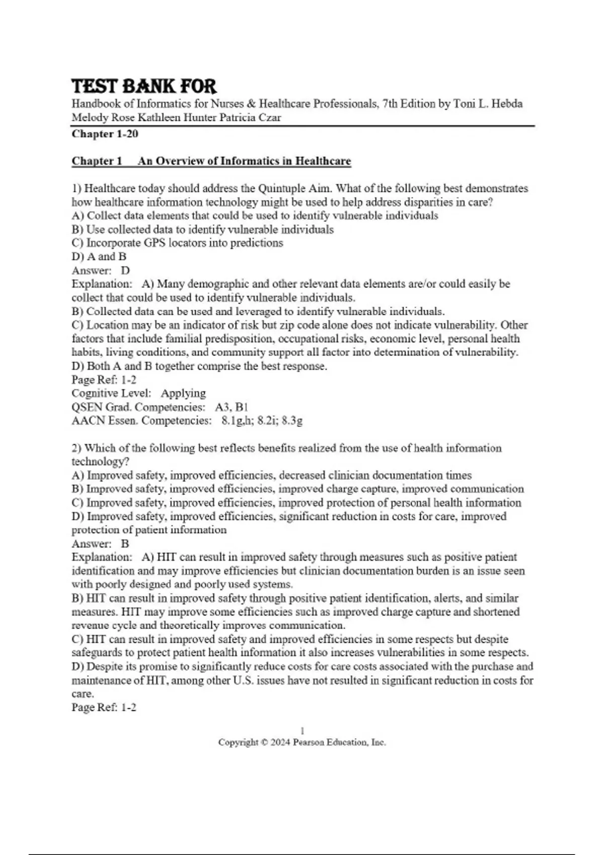 TEST BANK FOR Handbook of Informatics for Nurses & Healthcare Professionals, 7th Edition by Toni L. Hebda Melody Rose Kathleen Hunter Patricia Czar Chapter 1-20