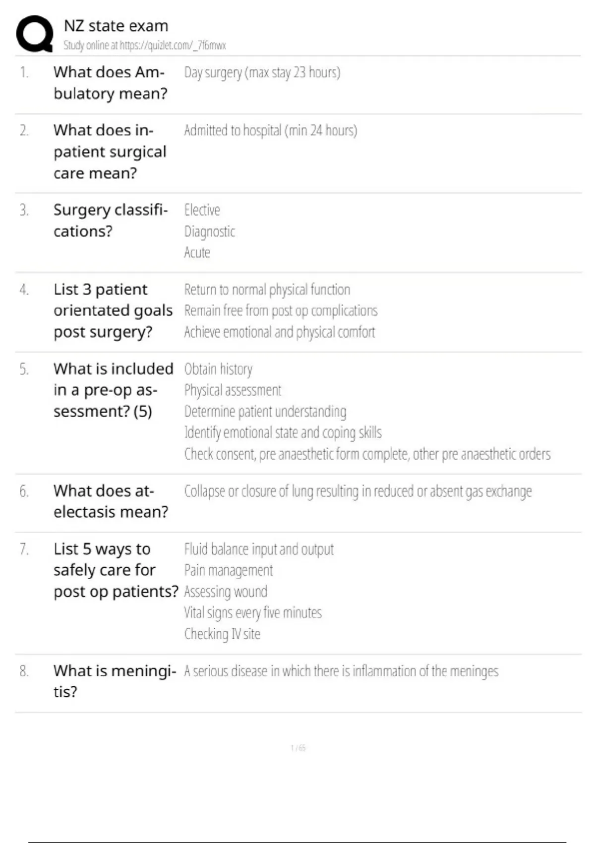 NZ NURSING STATE EXAM 2025 QUESTIONS WITH 100% CORRECT SOLUTIONS What does Ambulatory mean? Day surgery (max stay 23 hours) 2. What does inpatient surgical Admitted to hospital (min 24 hours) care mean? 3. Surgery classifications? Elective Diagnostic Acute