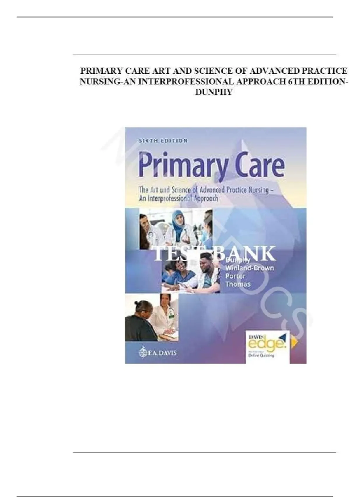 Primary Care The Art and Science of Advanced Practice Nursing – An Interprofessional Approach 6th Edition TEST BANK - Debera J. Dunphy is not a book but rather exam practice questions and answers. The Primary Care Nursing Interprofessional Test Bank is available for download immediately after purchase. Test Bank for Primary Care Nursing 6th Edition is your essential companion for mastering the complexities of Advanced Practice Nursing. As a student, you gain access to a comprehensive resource crafted to enhance your understanding of the subject matter. The test bank aligns with Debera J. Dunphy's esteemed textbook, offering a thorough exploration of the art and science of primary care through an interprofessional approach. You will find it invaluable in preparing for exams, with its targeted questions and answers designed to reinforce your knowledge. With the Interprofessional Practice Nursing Test Bank, you delve deeper into critical concepts and hone your expertise. Whether you are focusing on the Primary Care Art and Science Test Bank or the Advanced Practice Nursing Test Bank by Dunphy, this tool boosts your confidence and readiness for professional practice.