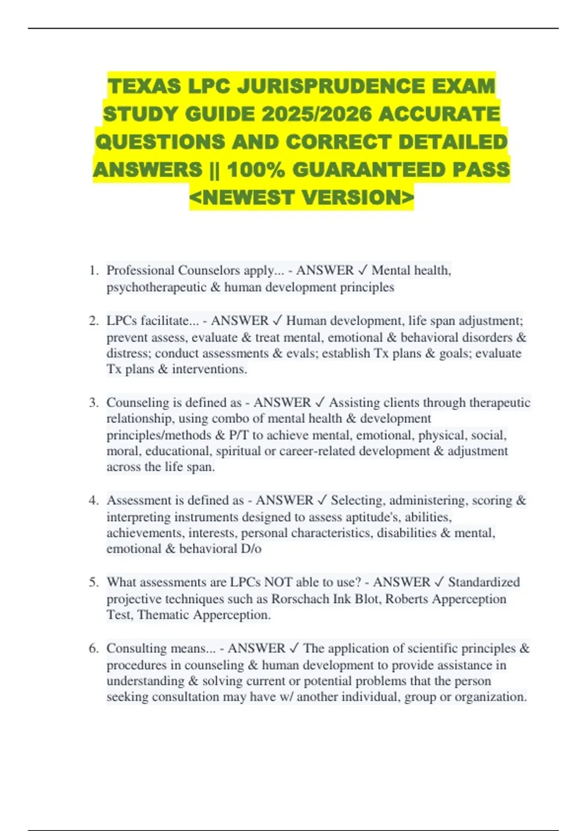 TEXAS LPC JURISPRUDENCE EXAM STUDY GUIDE 2025/2026 ACCURATE QUESTIONS AND CORRECT DETAILED ANSWERS || 100% GUARANTEED PASS &lt;NEWEST VERSION&gt; 1. Professional Counselors apply... - ANSWER Mental health, psychotherapeutic & human development principles 2. LPCs facilitate... - ANSWER Human development, life span adjustment; prevent assess, evaluate & treat mental, emotional & behavioral disorders & distress; conduct assessments & evals; establish Tx plans & goals; evaluate Tx plans & interventions. 3. Counseling is defined as - ANSWER Assisting clients through therapeutic relationship, using combo of mental health & development principles/methods & P/T to achieve mental, emotional, physical, social, moral, educational, spiritual or career-related development & adjustment across the life span. 4. Assessment is defined as - ANSWER Selecting, administering, scoring & interpreting instruments designed to assess aptitude's, abilities, achievements, interests, personal characteristics, disabilities & mental, emotional & behavioral D/o 5. What assessments are LPCs NOT able to use? - ANSWER Standardized projective techniques such as Rorschach Ink Blot, Roberts Apperception Test, Thematic Apperception. 6. Consulting means... - ANSWER The application of scientific principles & procedures in counseling & human development to provide assistance in understanding & solving current or potential problems that the person seeking consultation may have w/ another individual, group or organization. 7. Referral means... - ANSWER Evaluating & identifying needs of counselee to determine the advisability of referral to other specialists, informing the counselor of such judgement & communicating as requested if deemed appropriate to such referral source. 8. LPCs are regulated by... - ANSWER Texas Occupations Code Chapter 503 - Professional Counselors 9. Texas Occupations Code Chapter 503 - Professional Counselors is also known as - ANSWER Licensed Professional Counselors Act 10. Texas Occupations Code Chapter 503 - Professional Counselors aka Licensed Professional Counselors Act does NOT allow for... - ANSWER practice of medicine, law, counseling for government or educational institutions, counselor interns, federal employees, social workers, pastoral counselors, public/private nonprofits, rehab counselors & music therapists. 11. Does the Texas occupational code have a separate specialization for art therapy? - ANSWER YES 12. LPCs are regulated by - ANSWER Texas State Board of Examiners of Professional Counselors 13. Texas State Board of Examiners of Professional Counselors falls under - ANSWER The Department is State Health Services 14. Licensed Professional Counselor or Licensed Counselor implies... - ANSWER the person is licensed, trained, experienced or expert in counseling & engages in any practice of counseling w/ individuals, couples, families & groups for compensation. 15. Counseling treatment intervention means... - ANSWER application of cognitive, affective, behavioral, psychodynamic & systemic counseling strategies including developmental, wellness & psychological dysfunction that reflect a pluralistic society. 16. Can a LPC diagnose or treat a physical condition or D/o? - ANSWER No 17. Texas State Board of Examiners of Professional Counselors consists of... - ANSWER 9 members appointed by the governor including 5 LPCs (at least 3 in private practice & 1 counselor educator) & 4 members of the public. 18. True or false? An LPC shall report sexual misconduct there is reasonable cause to suspect that a client has been the victim of sexual exploitation, sexual contact or therapeutic deception by another licensee or a mental health provider. - ANSWER TRUE 19. Yes or no? An LPC shall report sexual misconduct if a client alleges sexual exploitation, sexual contact or therapeutic deception by another licensee or mental health services provider. - ANSWER YES 20. How long does an LPC have to report sexual misconduct? - ANSWER No later than the third (3rd) business day after the date the LPC became aware of the conduct or the allegations. 21. Who does the LPC report sexual misconduct to? - ANSWER 1-The prosecuting attorney and the county in which the alleged sexual exploitation, sexual contact or therapeutic deception occurred; 2-The board if the conduct involves a licensee and any other state licensing agency which licenses the mental health provider; 3-The appropriate agency relating to Confidentiality and Required Reporting 22. Yes or no? Does the LPC/reporter have to inform the alleged victim of the reporter's duty to report? - ANSWER YES, and determine if the alleged victim wants to remain anonymous. 23. What information does a report of sexual misconduct need to contain? - ANSWER 1-LPC/ reporter's identity; 2-identity of the alleged victim, unless the alleged victim has requested anonymity; 3-Express suspicion that sexual exploitation, sexual contact or therapeutic deception has occurred; 4 name of the alleged perpetrator. 24. If an LPC uses tests as part of a professional counseling relationship, Does the client need to be informed? - ANSWER YES, clients should know the purposes and explicit use of the test being used. 25. Can an LPCs use standardize projective techniques and tests? - ANSWER NO, the use of standardized projective techniques such as (but not limited to) the Rorschach Ink Blot, the Holtzman Ink Blot, the Thematic Apperception, Children's Apperception and/or Senior Apperception tests are PROHIBITED. 26. What is the Code of Ethics policy on an LPC's drug and alcohol use? - ANSWER Shall NOT 1-use alcohol or drugs in a manner that adversely affects the licensee's ability to provide counseling; 2-use illegal drugs of any kind; 3-promote, encourage or concur in the illegal use or possession of alcohol or drugs. 27. What is the code of ethics policy regarding confidentiality? - ANSWER Communication between a licensee and client and the clients records, however created or stored, or confidential u