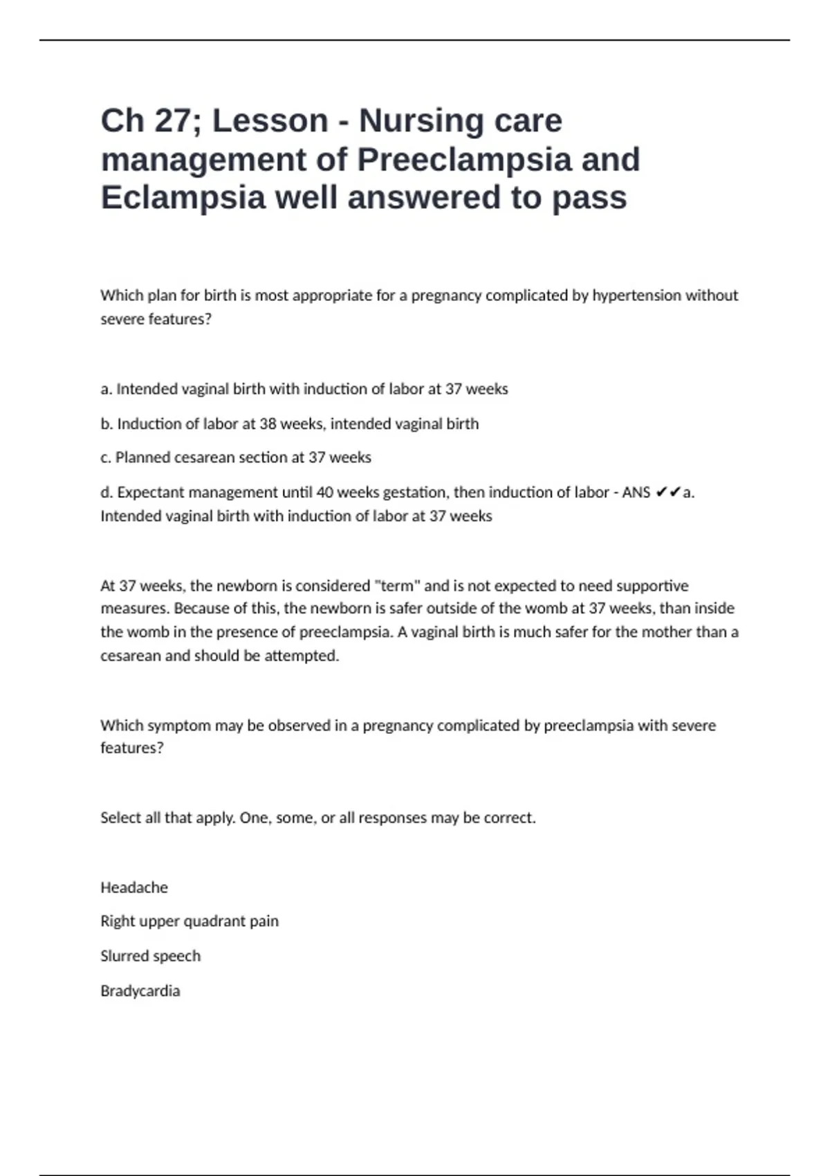 Ch 27; Lesson - Nursing care management of Preeclampsia and Eclampsia well answered to pass