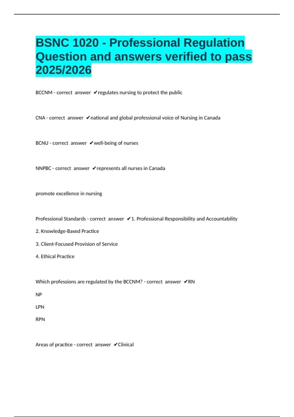 CNA - correct answer ✔national and global professional voice of Nursing in Canada