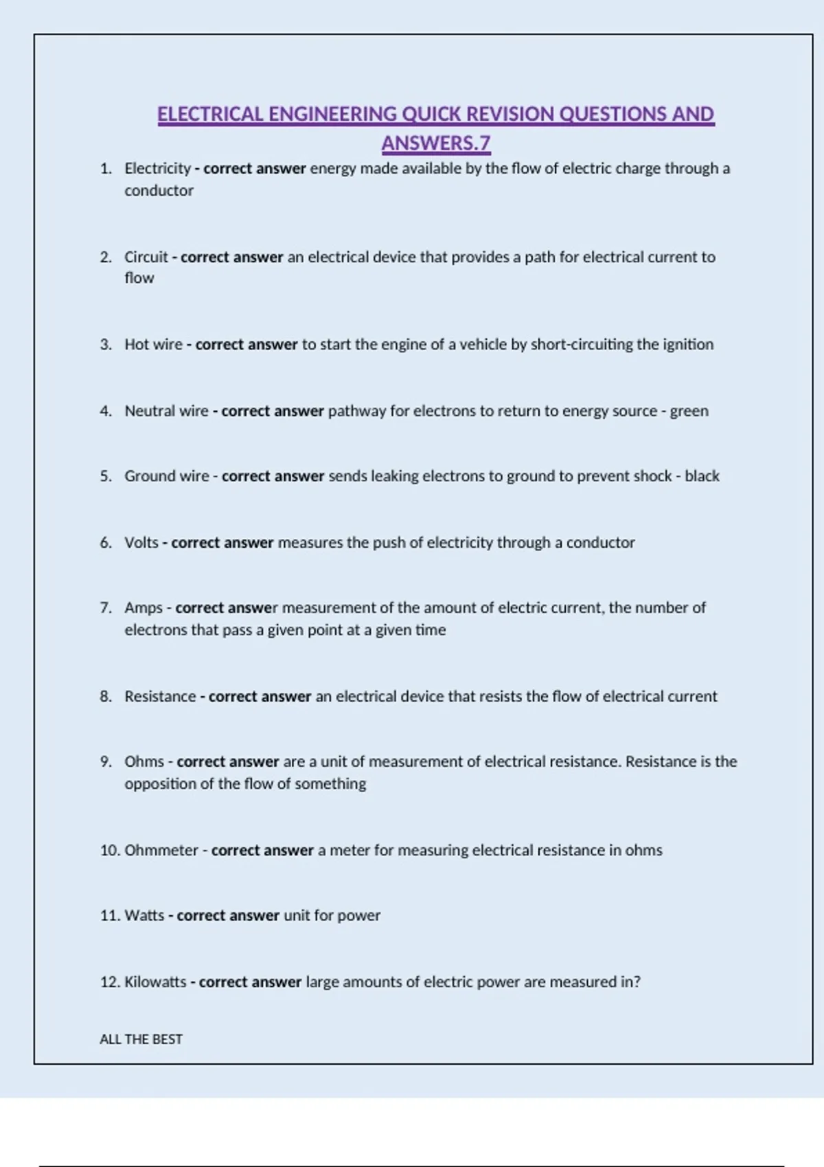 ELECTRICAL ENGINEERING QUICK REVISION QUESTIONS AND