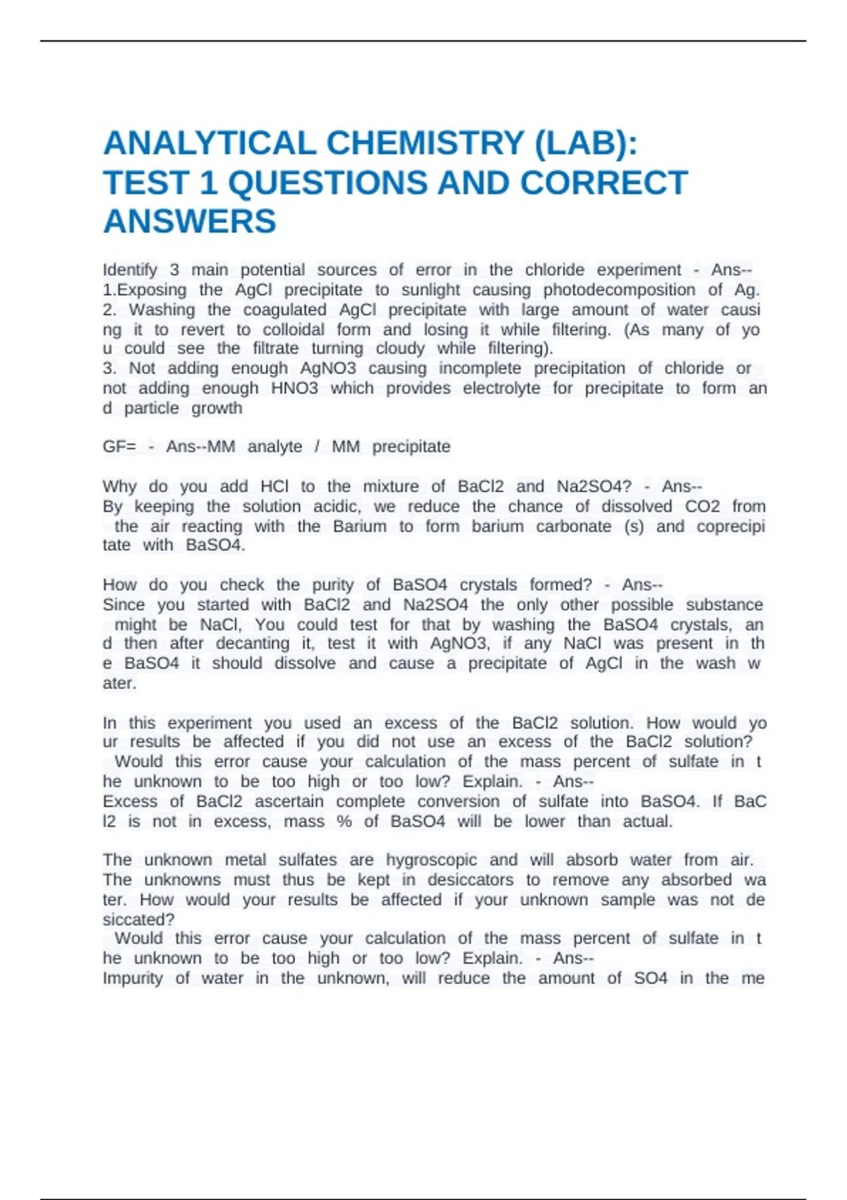 ANALYTICAL CHEMISTRY (LAB): TEST 1 QUESTIONS AND CORRECT ANSWERS
