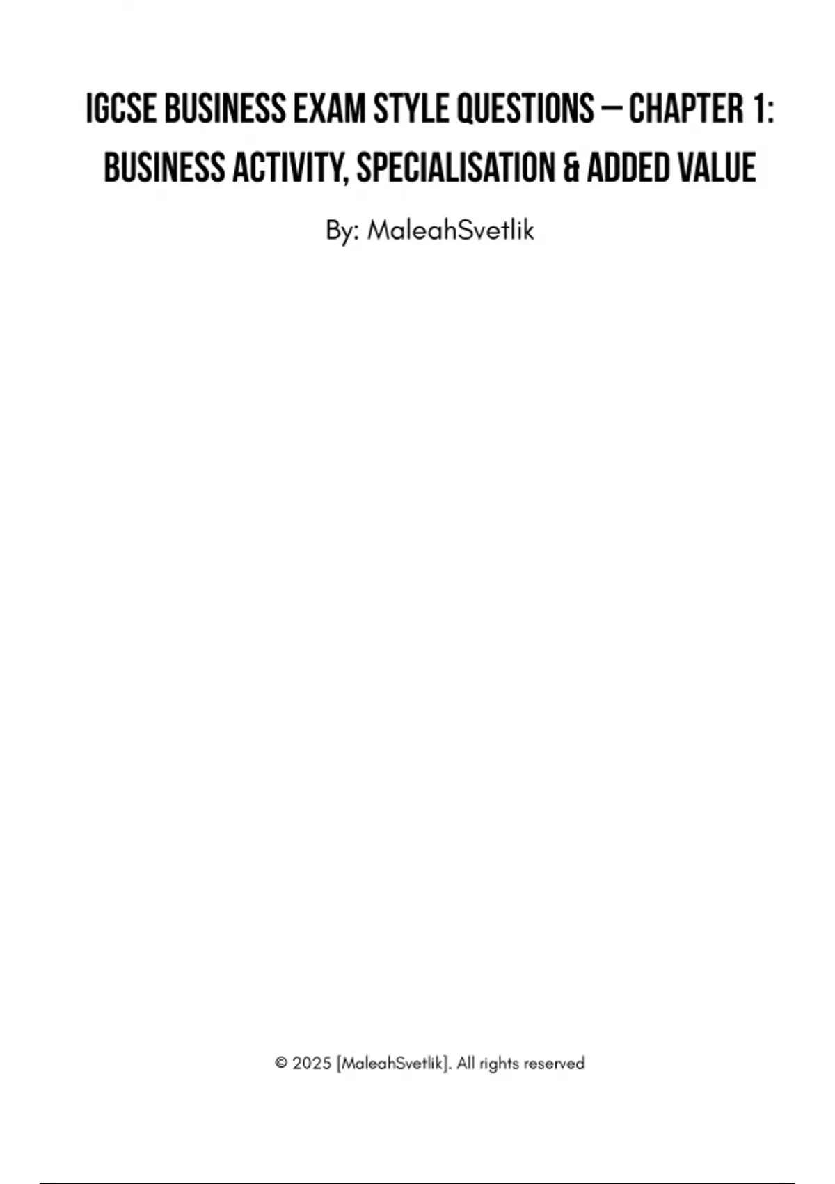 This resource contains a full set of IGCSE Business Studies (0450) Chapter 1 Practice Questions and Answers. It is designed to help students test their understanding of the first chapter of the syllabus, covering key concepts such as business activity, needs and wants, adding value, and the purpose of business enterprises. The document includes: ️ A wide range of original, exam-style practice questions (NOT real past paper questions) ️ Clear, well-structured answers for every question ️ Questions suitable for self-study, revision, homework, or class activities ️ Coverage of all major learning outcomes from Chapter 1 ️ Ideal for students aiming to strengthen their foundational understanding before moving to later chapters Perfect for IGCSE 0450 students who want to build confidence, improve exam technique, and revise essential concepts in a simple, effective way.