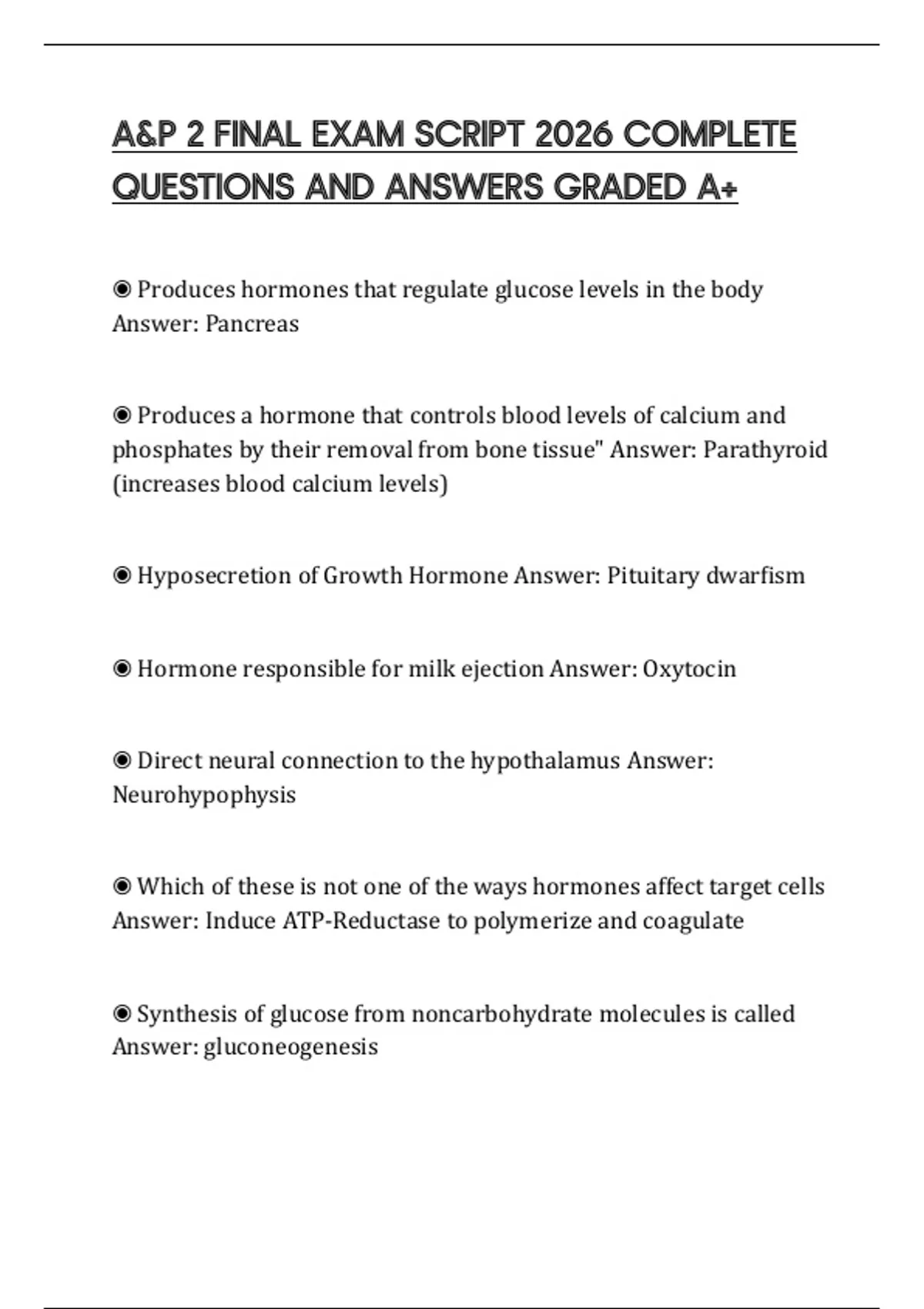 A&P 2 FINAL EXAM SCRIPT 2026 COMPLETE QUESTIONS AND ANSWERS GRADED A+