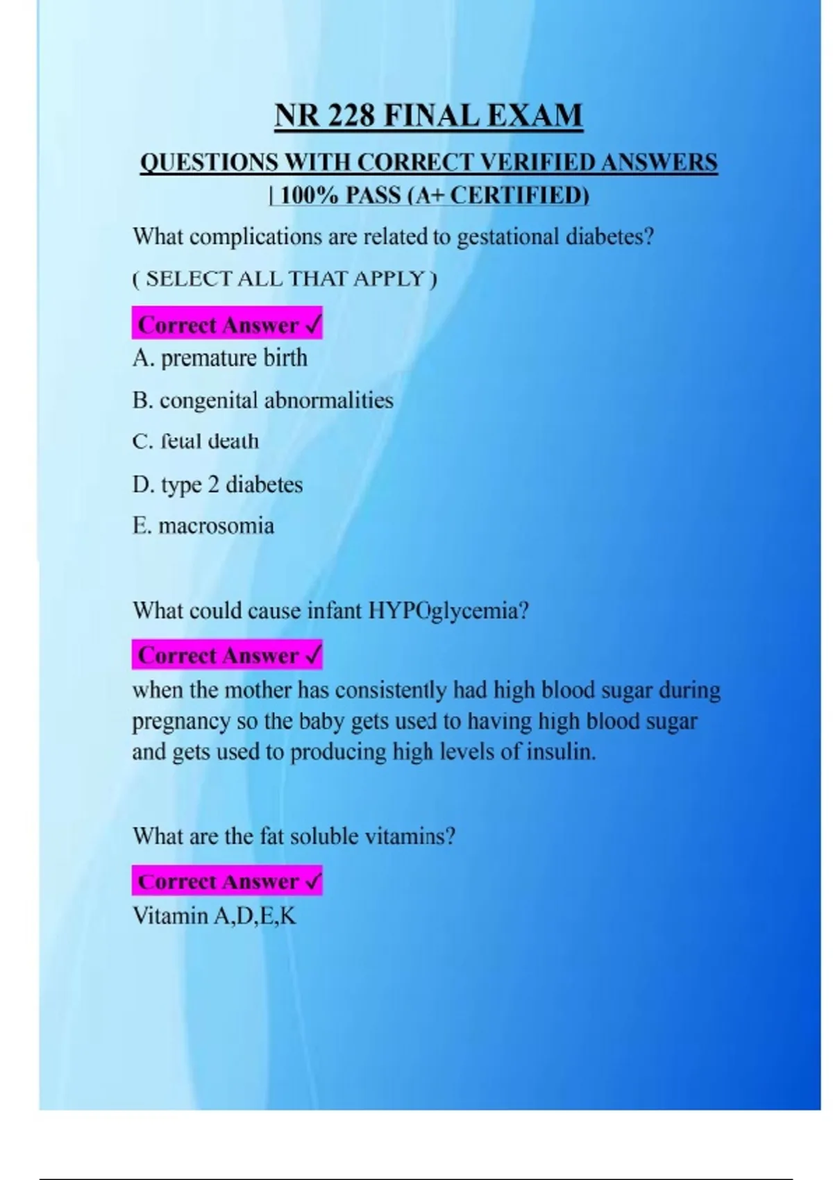 NR 228 FINAL EXAM QUESTIONS WITH CORRECT VERIFIED ANSWERS | 100% PASS (A+ CERTIFIED What complications are related to gestational diabetes? ( SELECT ALL THAT APPLY ) Correct Answer A. premature birth B. congenital abnormalities C. fetal death D. type 2 diabetes E. macrosomia What could cause infant HYPOglycemia? Correct Answer when the mother has consistently had high blood sugar during pregnancy so the baby gets used to having high blood sugar and gets used to producing high levels of insulin. What are the fat soluble vitamins? Correct Answer Vitamin A,D,E,K What are some food sources for MONOunsaturated fatty acids? Correct Answer olive oil peanuts avocado canola oil What are some food sources for POLYunsaturated fatty acids? Correct Answer vegetable oils fish margarine What type of cholesterol increases risk for CAD when elevated? Correct Answer LDL Where are nonessential amino acids found? Correct Answer created in the body When is a POSITIVE nitrogen balance common? Correct Answer growing children pregnant women people recovering from illness or an injury When is a NEGATIVE nitrogen balance common? Correct Answer aging adults physical illness extreme stress starvation surgery eating disorder What effects does the acid base balance have on proteins? Correct Answer if acid base balance gets off then proteins become denatured and are not able to perform their usual functions. What's the function of hemoglobin? Correct Answer Transports oxygen in the blood What is a complete protein? Correct Answer contains all nine essential amino acids What are some food sources for complete proteins? (SELECT ALL THAT APPLY) Correct Answer A. meats C. eggs D. dairy products