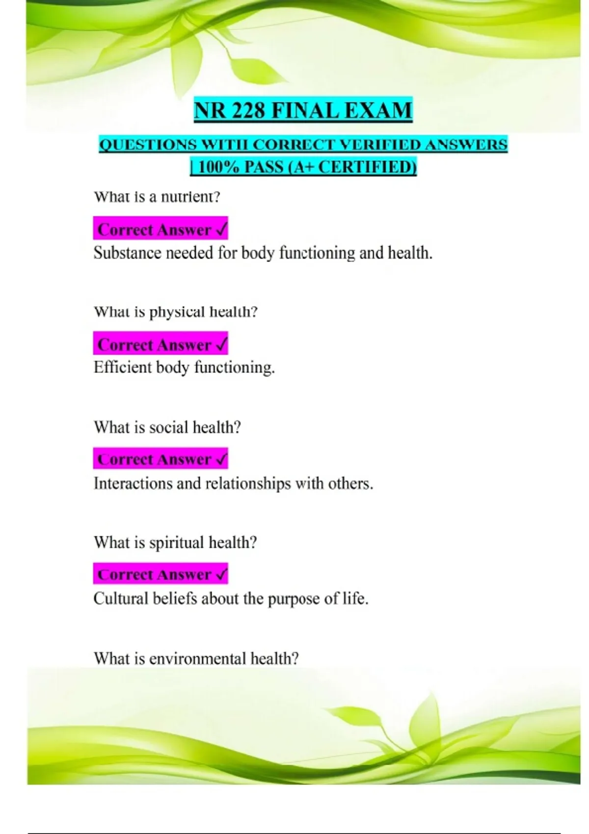 NR 228 FINAL EXAM QUESTIONS WITH CORRECT VERIFIED ANSWERS | 100% PASS (A+ CERTIFIEDWhat is a nutrient? Correct Answer Substance needed for body functioning and health. What is physical health? Correct Answer Efficient body functioning. What is social health? Correct Answer Interactions and relationships with others. What is spiritual health? Correct Answer Cultural beliefs about the purpose of life. What is environmental health? Correct Answer External factors that impact living and work. What are carbohydrates? Correct Answer Fuel and fiber for the body. What are proteins? Correct Answer Repair body tissue and provide nitrogen. What are fats? Correct Answer Components of cells and involved in hormone production. What are vitamins? Correct Answer Assist other nutrients and catalyze cellular processes. What are minerals? Correct Answer Contribute to cellular structure and affect fluid balance. Why is water important? Correct Answer Most important nutrient, necessary for survival. What are fortified foods? Correct Answer Foods with added nutrients to meet needs. What is the role of Vitamin A? Correct Answer Healthy eyesight and immune function. What is the role of Folate? Correct Answer Fetal development. What is the role of Zinc? Correct Answer Promotes immune function. What is the role of Iodine? Correct Answer Thyroid health and cognitive development. What is chemical digestion? Correct Answer Enzymes breaking down food. What is mechanical digestion? Correct Answer