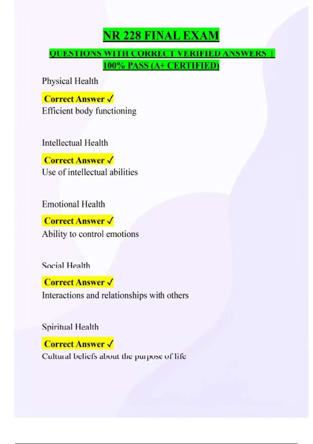NR 228 FINAL EXAM QUESTIONS WITH CORRECT VERIFIED ANSWERS | 100% PASS (A+ CERTIFIED Physical Health Correct Answer Efficient body functioning Intellectual Health Correct Answer Use of intellectual abilities Emotional Health Correct Answer Ability to control emotions Social Health Correct Answer Interactions and relationships with others Spiritual Health Correct Answer Cultural beliefs about the purpose of life Environmental Health Correct Answer External factors that impact living and work settings. Location Race Ethnicity Education Income Correct Answer Disparities that contribute to food insecurity: -Only mammals with cloven hooves that chew the cud may be eaten and the milk consumed: cattle, deer, goats and sheep. Birds must meet specific criteria: chickens, ducks, geese and turkey. Fish must have fins and scales. -Animals must be slaughtered in a specific manner that is quick and painless -Slaughtered animals must be healthy -Blood and solid fat may not be consumed from any animal. -Special preparation for consumption (kosher) -Meat and dairy my not be consumed or stored together or cooked together. Correct Answer Jewish dietary laws (Kashrut): Swine (pigs) and birds of prey may not be consumed Animals must be slaughtered according to specific rules similar to Jewish law. Alcoholic beverages and drugs that affect consciousness unless required for medicinal purposes are prohibited. Correct Answer Islamic dietary Laws (Halal) Carbohydrates Correct Answer Provides Energy Proteins Correct Answer Provides energy, regulates body processes and aids in growth and repair Lipids (fat) Correct Answer Provides energy, regulates body processes and repair Vitamins Correct Answer Aids in energy (catalyst) regulates body functions Minerals Correct Answer Aids in energy (catalyst) regulates body functions and aids in growth and healing Water Correct Answer