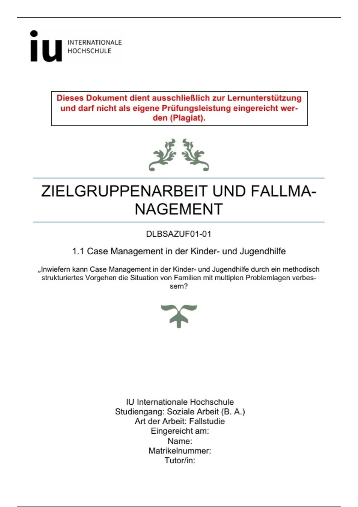 Dieses Dokument enthält eine vollständig ausgearbeitete Fallstudie aus dem Modul „Zielgruppenarbeit und Fallmanagement“ (DLBSAZUF01) im Studiengang Soziale Arbeit (B.A.). Die Arbeit behandelt die methodische Anwendung von Case Management in der Kinder- und Jugendhilfe und zeigt Schritt für Schritt, wie ein strukturiertes Vorgehen Familien mit multiplen Problemlagen unterstützen kann. Behandelt werden unter anderem die Phasen des Case Managements, besondere Anforderungen der Kinder- und Jugendhilfe, eine ausführliche Fallbeschreibung, die Analyse von Mikro-, Meso- und Makrozielen, gesetzliche Grundlagen nach SGB VIII sowie Linking-Prozesse, Monitoring und die Einbindung weiterer Zielgruppenangebote. Die Fallstudie eignet sich hervorragend als Lernhilfe, um Aufbau, Struktur, Inhalt und wissenschaftliche Ausarbeitung im Kontext einer Fallanalyse besser zu verstehen. (Note: 1,7)