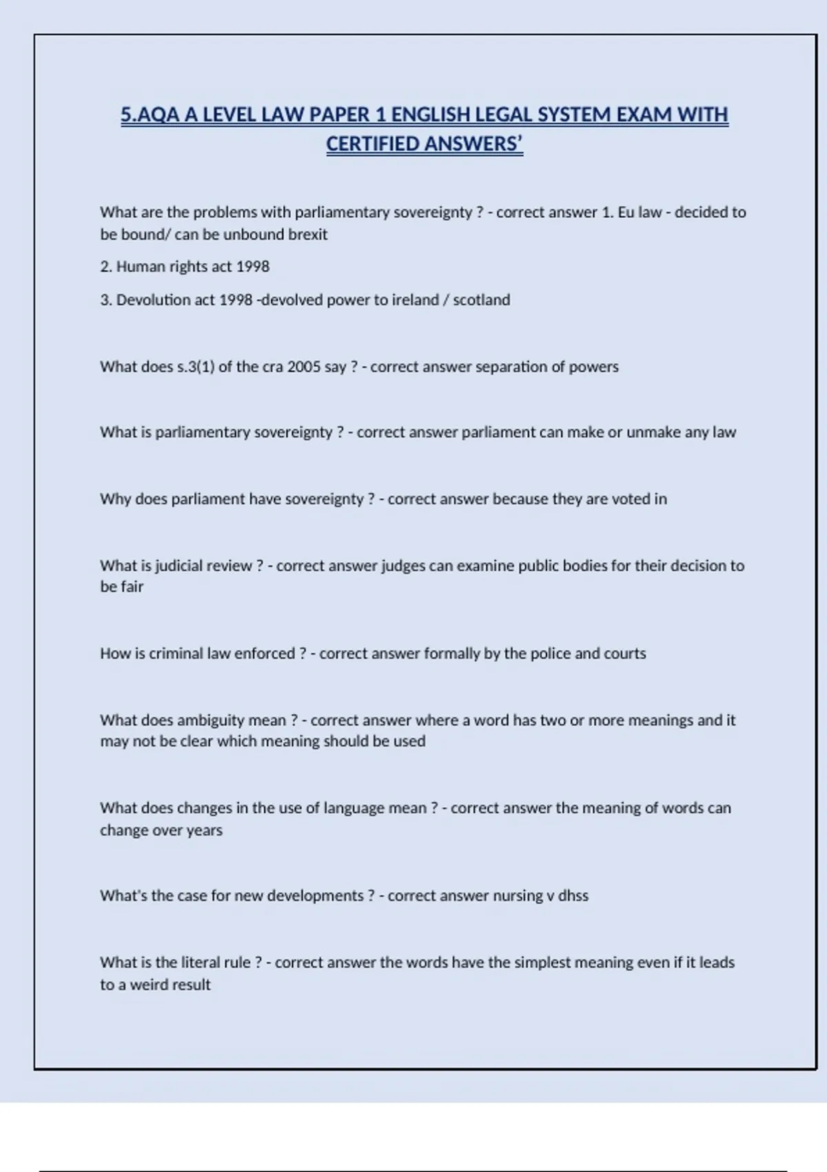 5.AQA A LEVEL LAW PAPER 1 ENGLISH LEGAL SYSTEM EXAM WITH