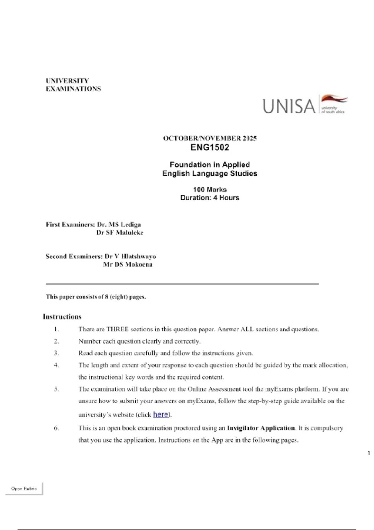 ENG1502 EXAM OCTOBER 2025 (Questions and Answers) Questions with certified and verified answers