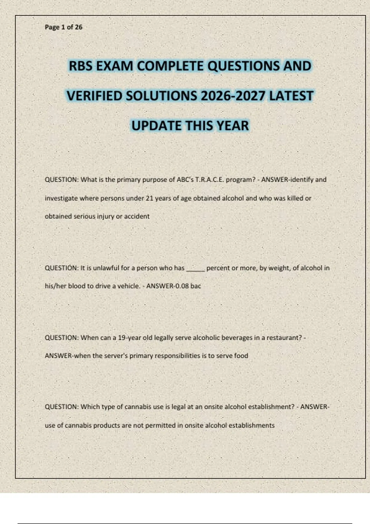 Tap on AVAILABLE IN BUNDLE/PACKAGE DEAL to unlock free bonus exams — save more while getting everything you need! You’ll be glad you did! RBS Exam COMPLETE QUESTIONS AND VERIFIED SOLUTIONS 2026–2027 LATEST UPDATE THIS YEAR is a fully updated and easy-to-follow study resource designed to help servers, bartenders, managers, and alcohol service professionals confidently pass the Responsible Beverage Service certification exam. This comprehensive guide includes complete exam-style questions with verified solutions, covering essential topics such as responsible alcohol service practices, state and local alcohol laws, age verification and ID checking, recognizing and preventing intoxication, intervention techniques, liability and compliance, and public safety responsibilities. Structured for efficient study and real-world understanding, this resource helps reduce exam anxiety, reinforce key concepts, and ensure you are fully prepared to pass the RBS exam on your first attempt with confidence.