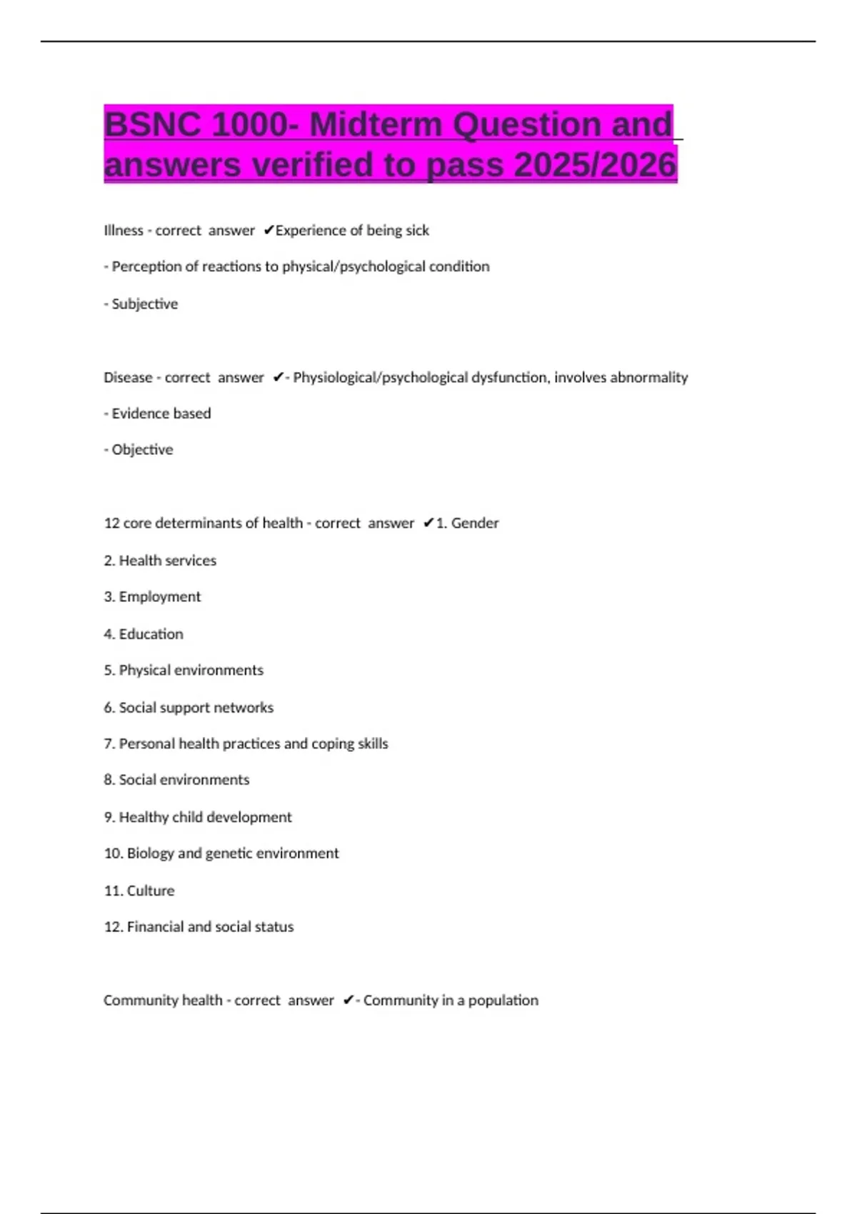 BSNC 1000- Midterm Question and answers verified to pass 2025/2026 Illness - correct answer Experience of being sick - Perception of reactions to physical/psychological condition - Subjective Disease - correct answer - Physiological/psychological dysfunction, involves abnormality - Evidence based - Objective 12 core determinants of health - correct answer 1. Gender 2. Health services 3. Employment 4. Education 5. Physical environments 6. Social support networks 7. Personal health practices and coping skills 8. Social environments