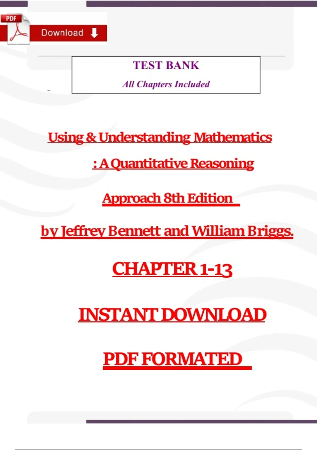 Master quantitative reasoning and mathematical problem-solving with this complete Test Bank for Using & Understanding Mathematics: A Quantitative Reasoning Approach, 8th Edition by Jeffrey O. Bennett, covering all chapters. This comprehensive academic resource includes multiple choice questions, short answer items, and applied problem-solving exercises with verified answers, helping students, instructors, and mathematics educators develop critical thinking, numerical literacy, statistical reasoning, algebraic modeling, logic and set theory, probability concepts, graph interpretation, mathematical communication, real-world application of formulas, quantitative analysis, data interpretation, and financial mathematics skills. Designed for exam preparation, quizzes, homework assignments, and classroom assessments, this test bank strengthens conceptual understanding, improves analytical reasoning, and enhances practical application of mathematics in everyday life. Ideal for undergraduate math, business, social science, and general education programs, it also serves as a reliable instructor resource for creating effective assessments. As a supplemental study guide, it supports academic success and mastery of quantitative reasoning. Critical thinking in math, numerical literacy development, statistical reasoning exercises, algebraic modeling problems, logic and set theory, probability practice questions, graphing and data interpretation, applied mathematical problems, quantitative analysis skills, real-world formula applications, financial mathematics concepts, academic exam preparation, instructor assessment tools, higher education math support, student learning enhancement.