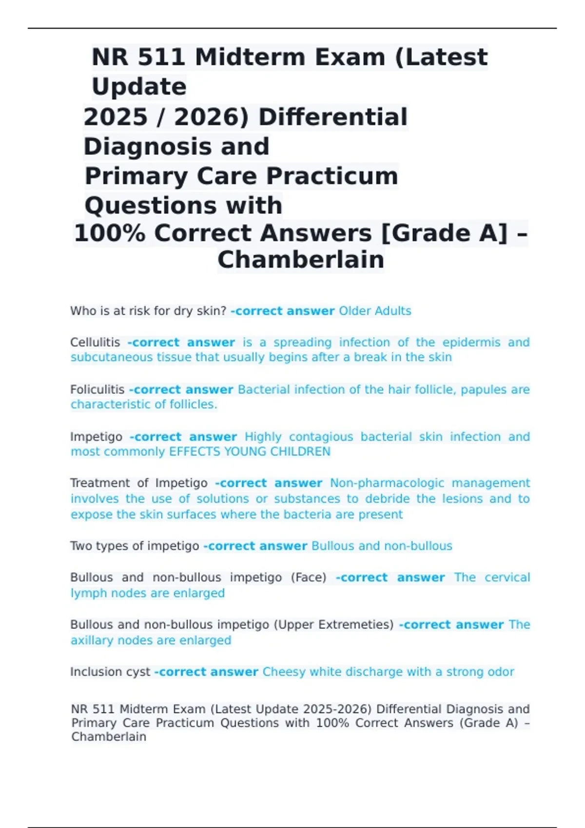 Impetigo -correct answer Highly contagious bacterial skin infection and
