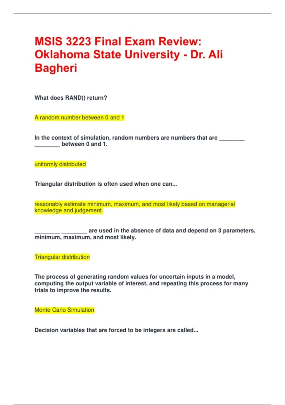 MSIS 3223 Final Exam Review: Oklahoma State University - Dr. Ali Bagheri What does RAND() return? A random number between 0 and 1 In the context of simulation, random numbers are numbers that are ________ ________ between 0 and 1. uniformly distributed Triangular distribution is often used when one can... reasonably estimate minimum, maximum, and most likely based on managerial knowledge and judgement. ________ ________ are used in the absence of data and depend on 3 parameters, minimum, maximum, and most likely. Triangular distribution The process of generating random values for uncertain inputs in a model, computing the output variable of interest, and repeating this process for many trials to improve the results. Monte Carlo Simulation Decision variables that are forced to be integers are called... Integer Variables Many optimization models require _________ __________, which are variables restricted to being either 0 or 1. Binary Variables In an integer linear optimization model some or all of the variables are... restricted to being whole numbers A _________ _________ is one for which the left-hand side is equal to the right-hand side of the constraint at the optimal solution. Binding Constraint When a problem is infeasible, Solver will report: "Solver could not find a feasible solution." Set of point that satisfy all constraints simultaneously Feasible Region The set of feasible solutions is often called the _________ _________. Feasible Region Linear programs generally have an infinite number of feasible solutions. T/F True