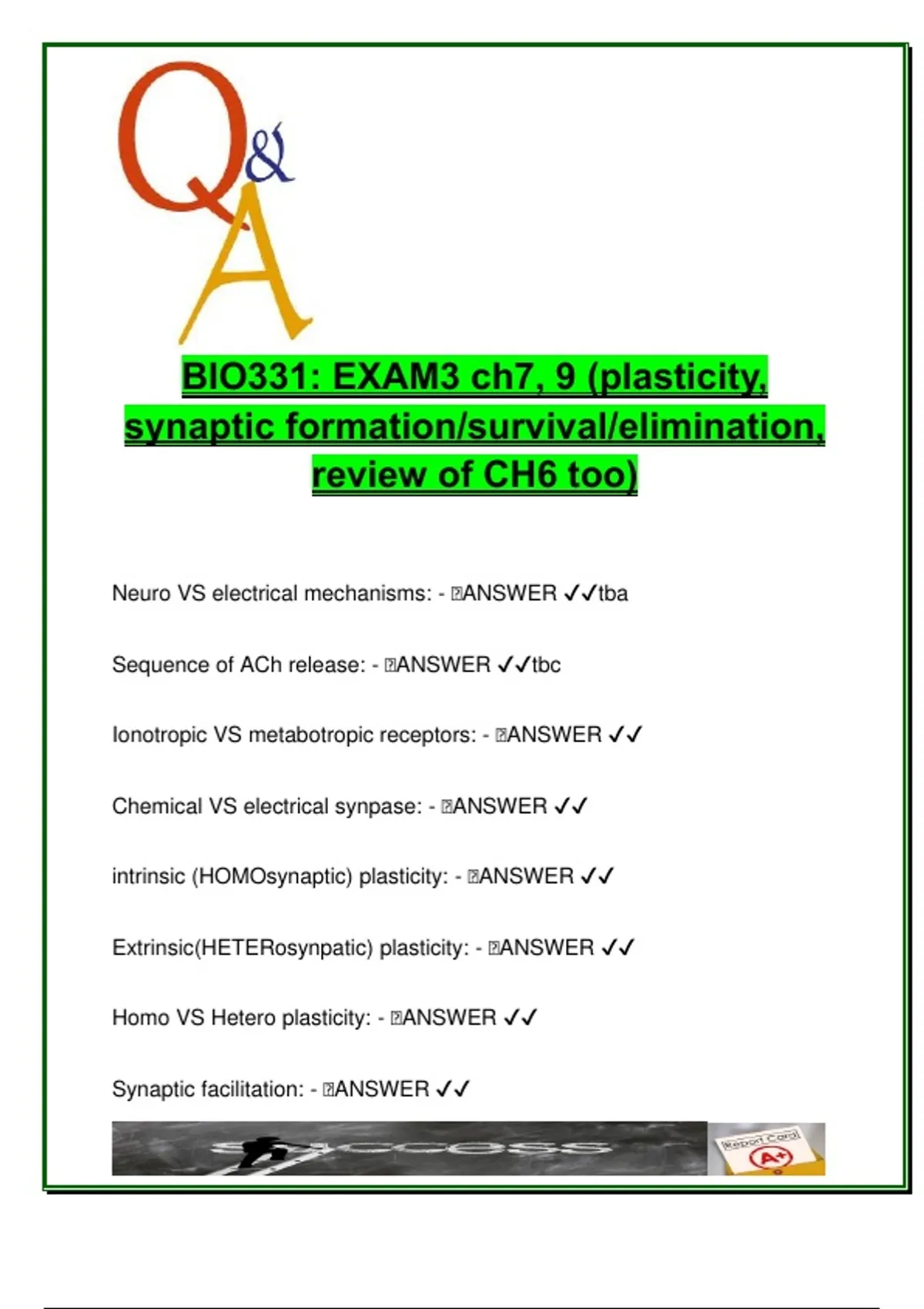 This document is a focused exam preparation guide for BIO331 Exam 3, containing approximately 45 structured questions that comprehensively cover Chapters 7 and 9, with an integrated review of key concepts from Chapter 6. It is designed to support students in mastering synaptic plasticity, synapse formation and elimination, axon guidance, and neural regeneration through clearly organized, exam-style prompts that reflect typical university assessment formats. The content provides in-depth coverage of intrinsic (homosynaptic) and extrinsic (heterosynaptic) plasticity, including synaptic facilitation, synaptic depression, temporal summation, presynaptic inhibition and facilitation, and calcium-dependent mechanisms underlying short-term synaptic changes. Long-term potentiation (LTP) is explored in detail, with emphasis on experimental induction, NMDA versus AMPA receptor function, magnesium block removal, calcium signaling, and the molecular mechanisms that support learning and memory. The document also addresses neural development and repair, including growth cone dynamics, lamellipodia and filopodia function, guidepost cells, fasciculation, and the chemoaffinity hypothesis. Cell adhesion molecules such as CAMs, cadherins, integrins, laminin, and fibronectin are compared in the context of axon pathfinding and synaptic stabilization. In addition, the material explains peripheral versus central nervous system regeneration, the roles of Schwann cells, oligodendroglia, macrophages, and nerve growth factor (NGF), and why damage to the adult CNS is often irreversible. Emerging therapeutic approaches, including tissue transplants and stem cell strategies, are also discussed at a conceptual level. This resource is well suited for undergraduate students enrolled in Neurobiology, Cellular Neuroscience, Developmental Neuroscience, Human Physiology, Biomedical Sciences, Biology, or Health Sciences programs. It is particularly valuable for students preparing for midterms, cumulative exams, or focused reviews on synaptic plasticity and neural regeneration, as well as for learners who prefer concise, mechanism-driven study materials aligned with university-level examinations. Keywords: synaptic plasticity, homosynaptic plasticity, heterosynaptic plasticity, synaptic facilitation, synaptic depression, presynaptic inhibition, long term potentiation, NMDA receptors, AMPA receptors, calcium signaling, axon guidance, growth cone, chemoaffinity hypothesis, cell adhesion molecules, neural regeneration, CNS vs PNS, nerve growth factor, BIO331 exam
