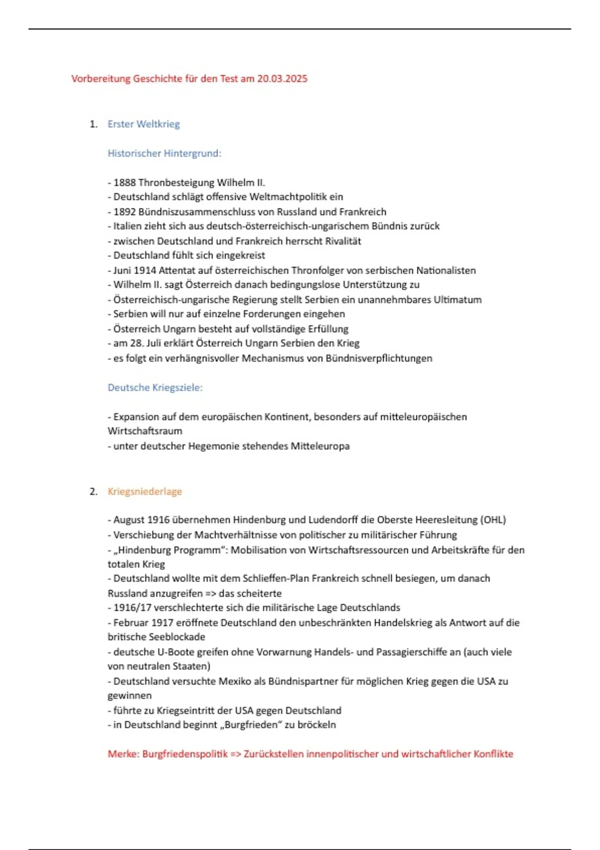 Vorbereitung Geschichte für den Test am 20.03.2025