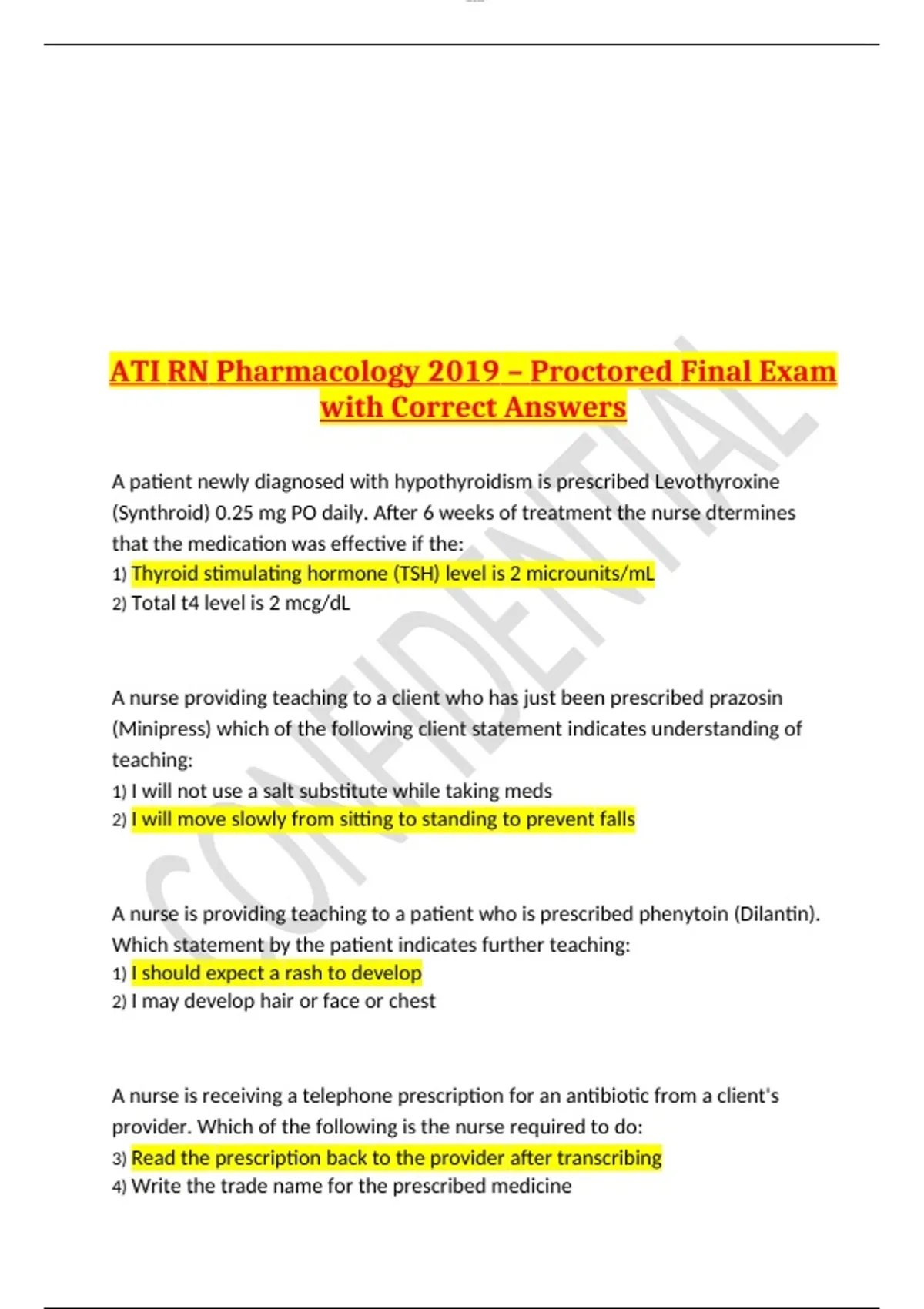 ATI RN Pharmacology 2019 – Proctored Final Exam with Correct Answers
