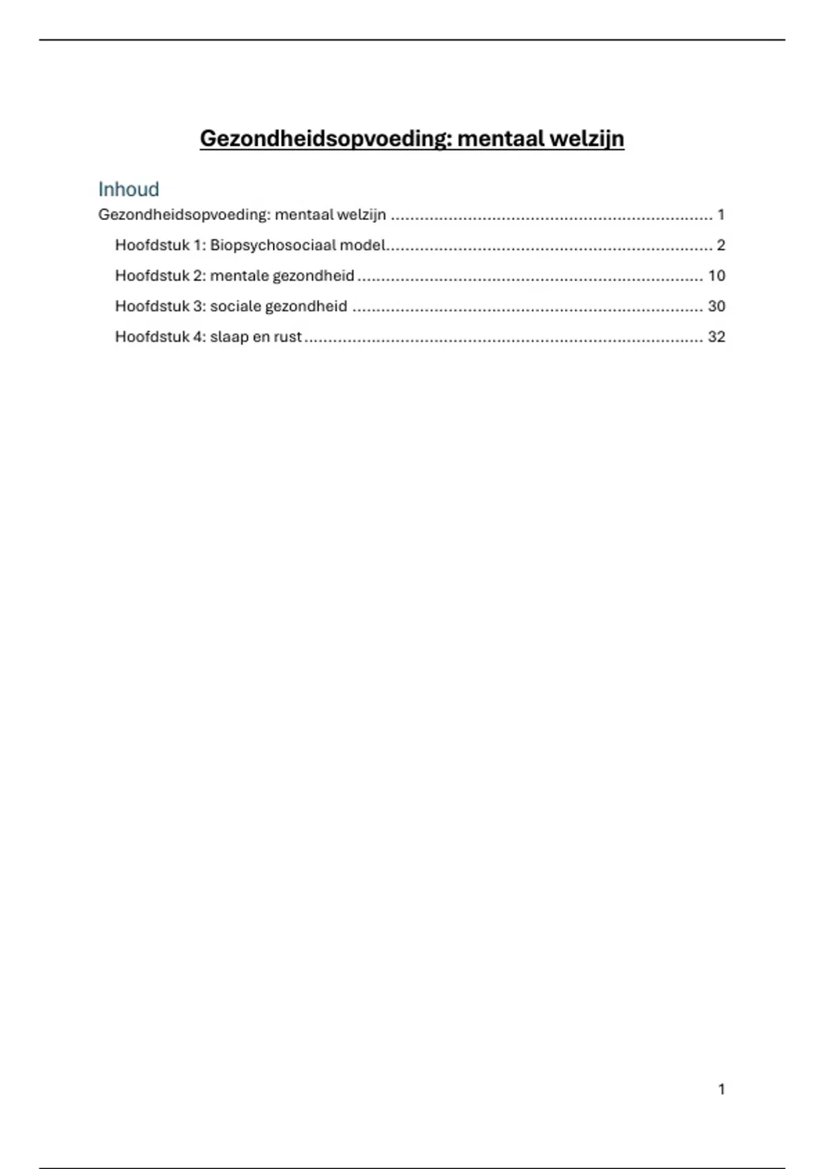 1. Biopsychosociaal model 2. Mentale gezondheid 3. Sociale gezondheid 4. Slaap en rust Samenvatting van 53 pagina's over het vak mentaal welzijn, gebaseerd op de cursus en de PowerPoint's.