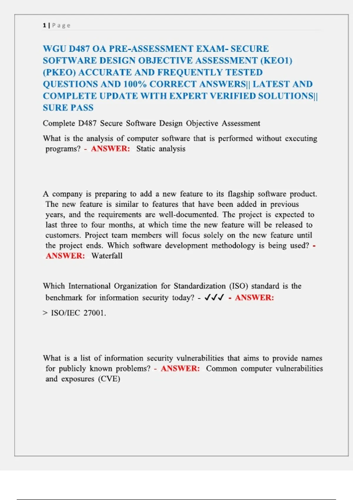 This is a comprehensive, expert-verified study resource for the WGU D487 Secure Software Design Objective Assessment (OA). It features a complete set of frequently tested pre-assessment questions with 100% correct answers. Key topics include static and dynamic software analysis, the Common Vulnerabilities and Exposures (CVE) system, and the ISO/IEC 27001 information security benchmark. The guide provides clear explanations of secure coding practices and software development methodologies, such as the Waterfall model, specifically tailored to ensure a passing score on the first attempt.