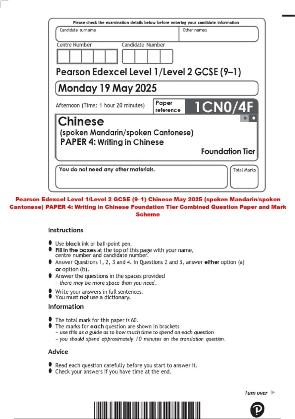 Pearson Edexcel Level 1/Level 2 GCSE (9–1) Chinese May 2025 (spoken Mandarin/spoken Cantonese) PAPER 4: Writing in Chinese Foundation Tier Combined Question Paper and Mark Scheme