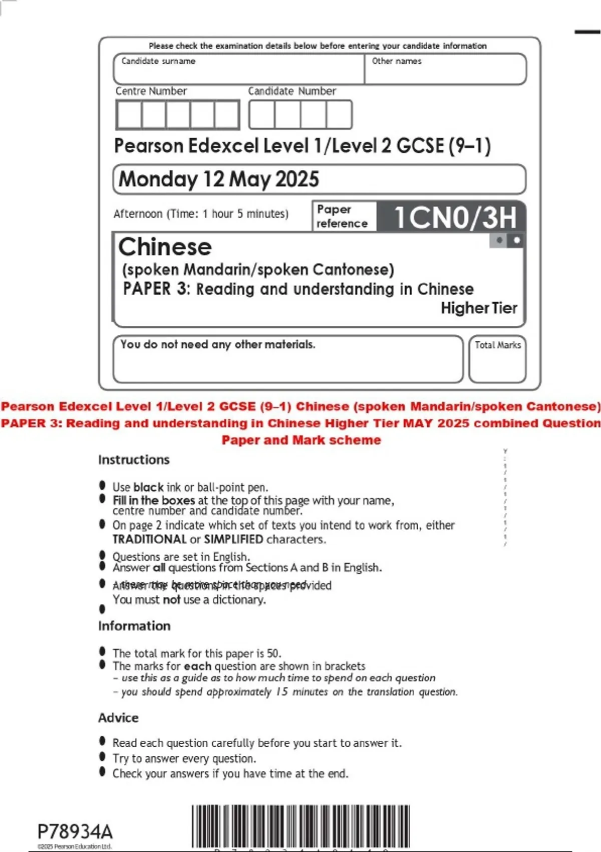 Pearson Edexcel Level 1/Level 2 GCSE (9–1) Chinese (spoken Mandarin/spoken Cantonese) PAPER 3: Reading and understanding in Chinese Higher Tier MAY 2025 combined Question Paper and Mark scheme